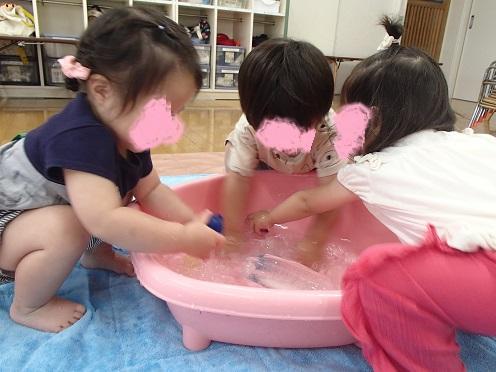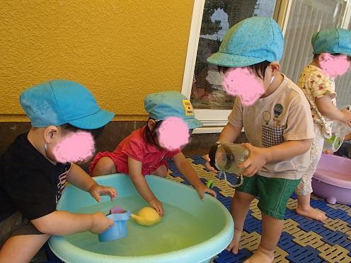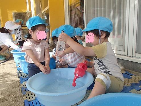 最初は水に怖がる子も中には数名いましたが徐々に慣れ、水に触れてみたりじょうろで足や腕に水をあててみたりと、冷たさを感じて水あそびを思い思いに楽しんでいます🌚🎶