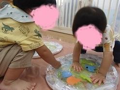 感触あそびでは、アイスキューブや氷に触れて楽しむ姿が見られるようになりました。「水あそびするよ」と保育教諭が声をかけると、嬉しそうに駆け出したり外に出るために自分から腕を広げたりとやる気満々の子どもたちです。😊