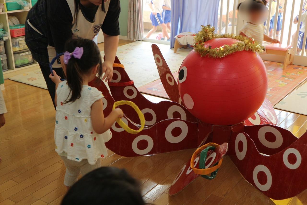 乳児クラスはぺんぎん組の保育室で開催され、大きなたこの輪投げにみんな大喜びでした💕