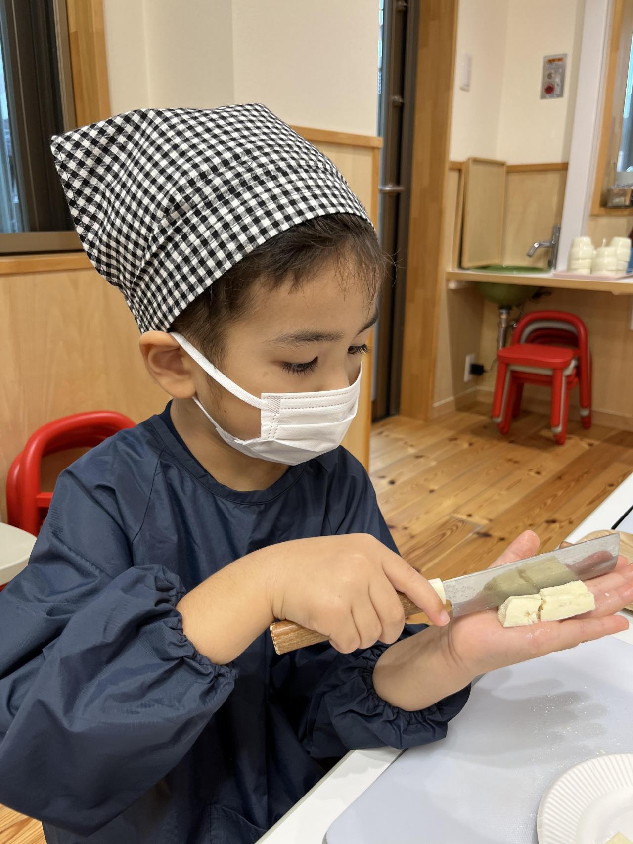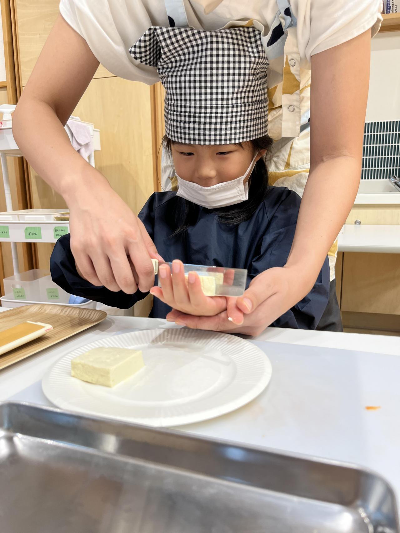 5歳児さんは手の平での豆腐切りにも挑戦!