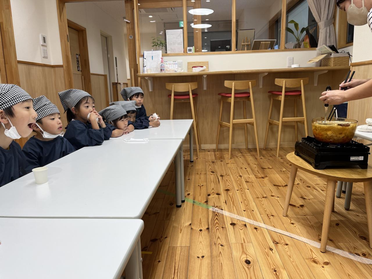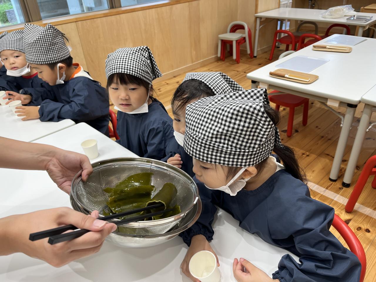 5歳児(紫名札)さんが皮を剥いて、ヘタを切って…と下準備をしてくれ