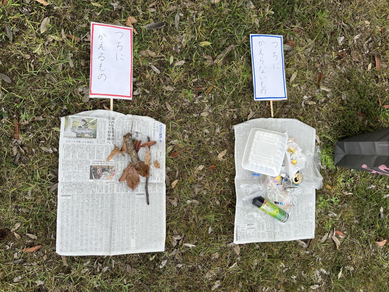 落ちていたゴミを「つちにかえるもの・つちにかえらないもの」にみんなで相談しながら分けました。