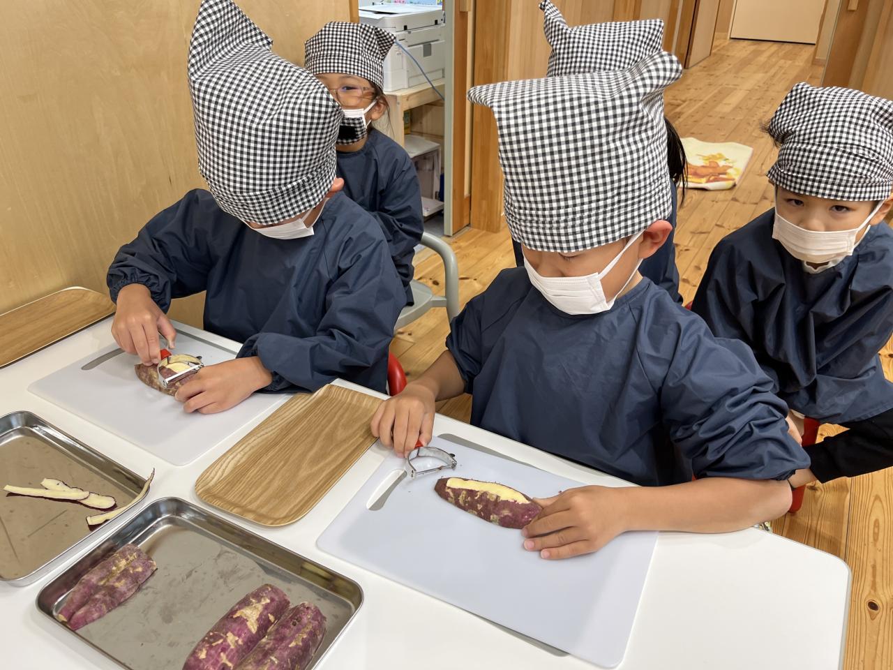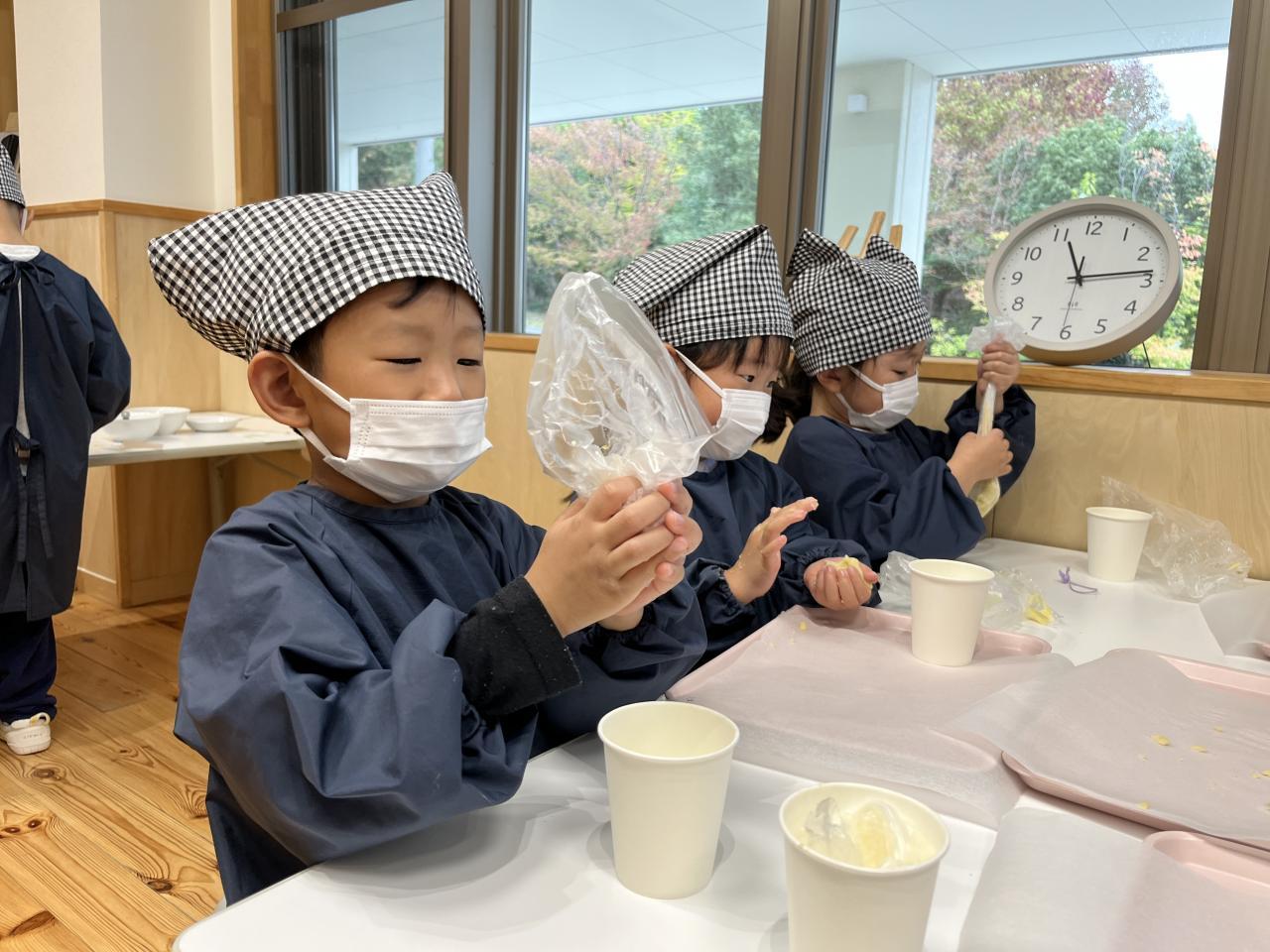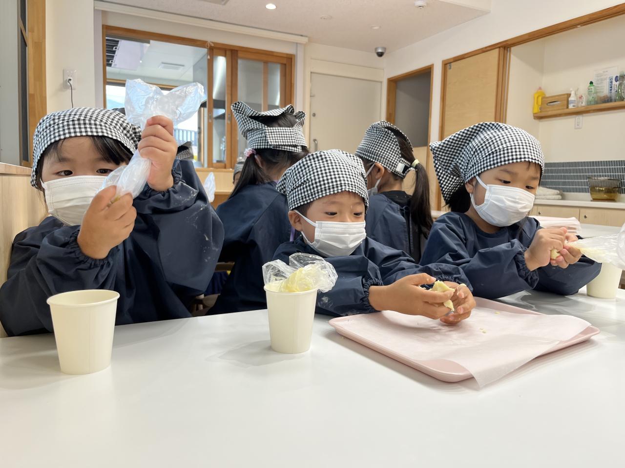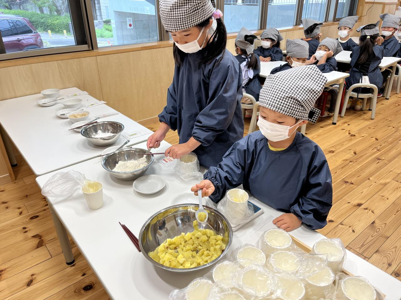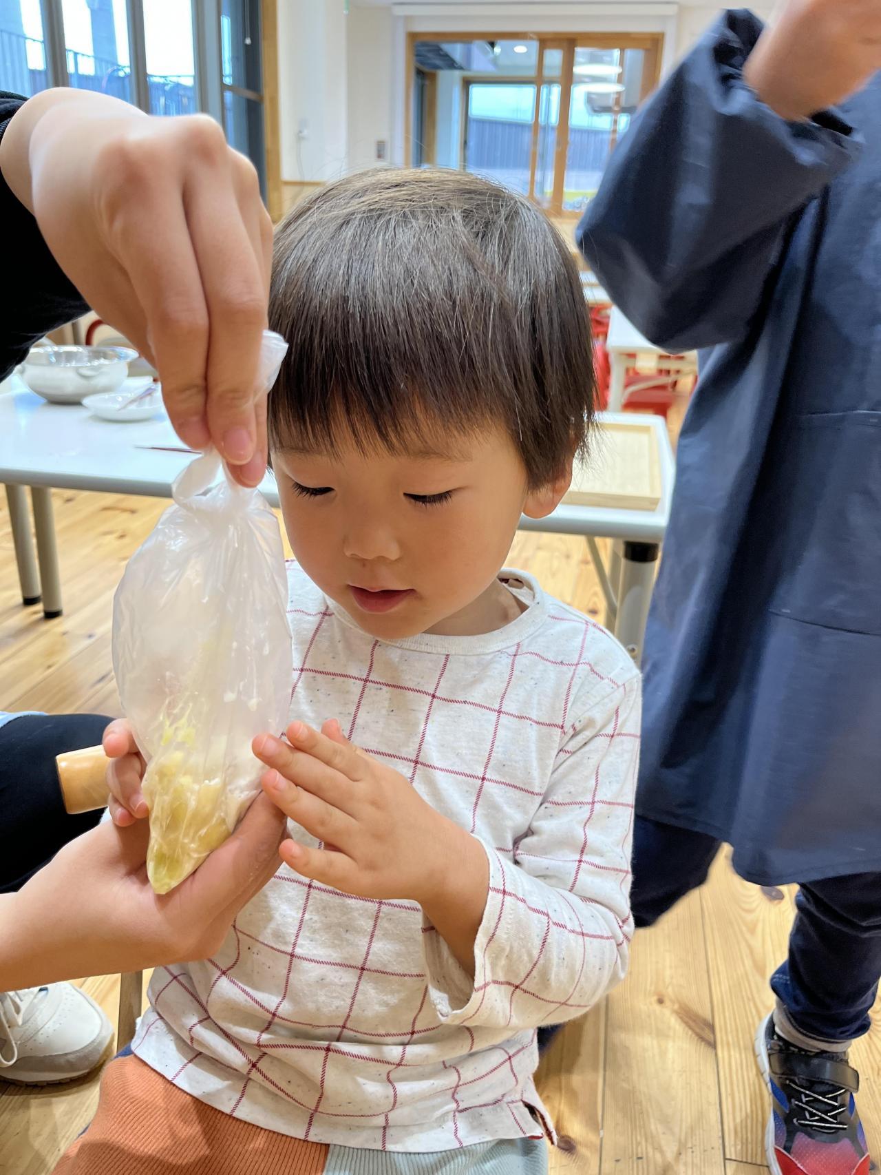 さつまいもが潰れていく感触や材料が混ざっていく様子が楽しい子ども達🥰
