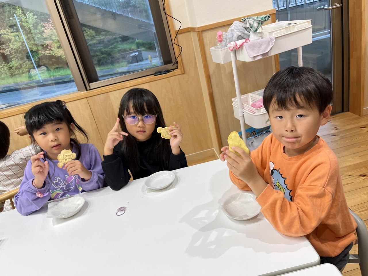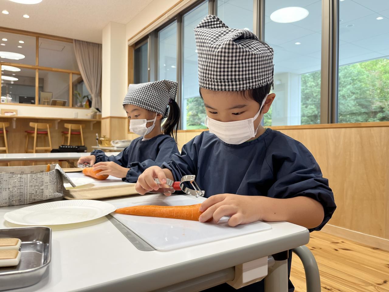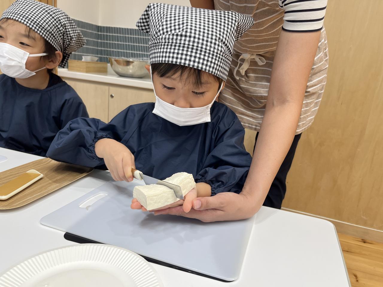 クッキングでは、初めて皮むきに挑戦したり、手の上に豆腐をのせて切ったり、自分たちで作るものを決めたり、