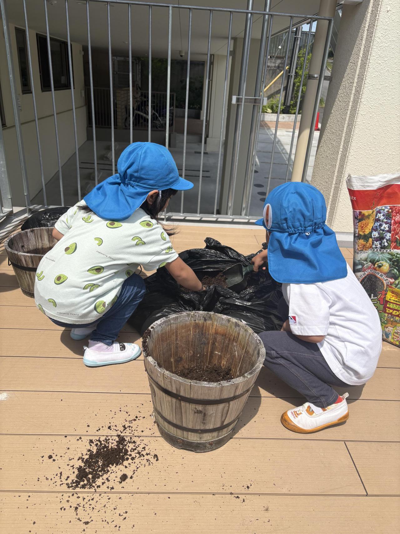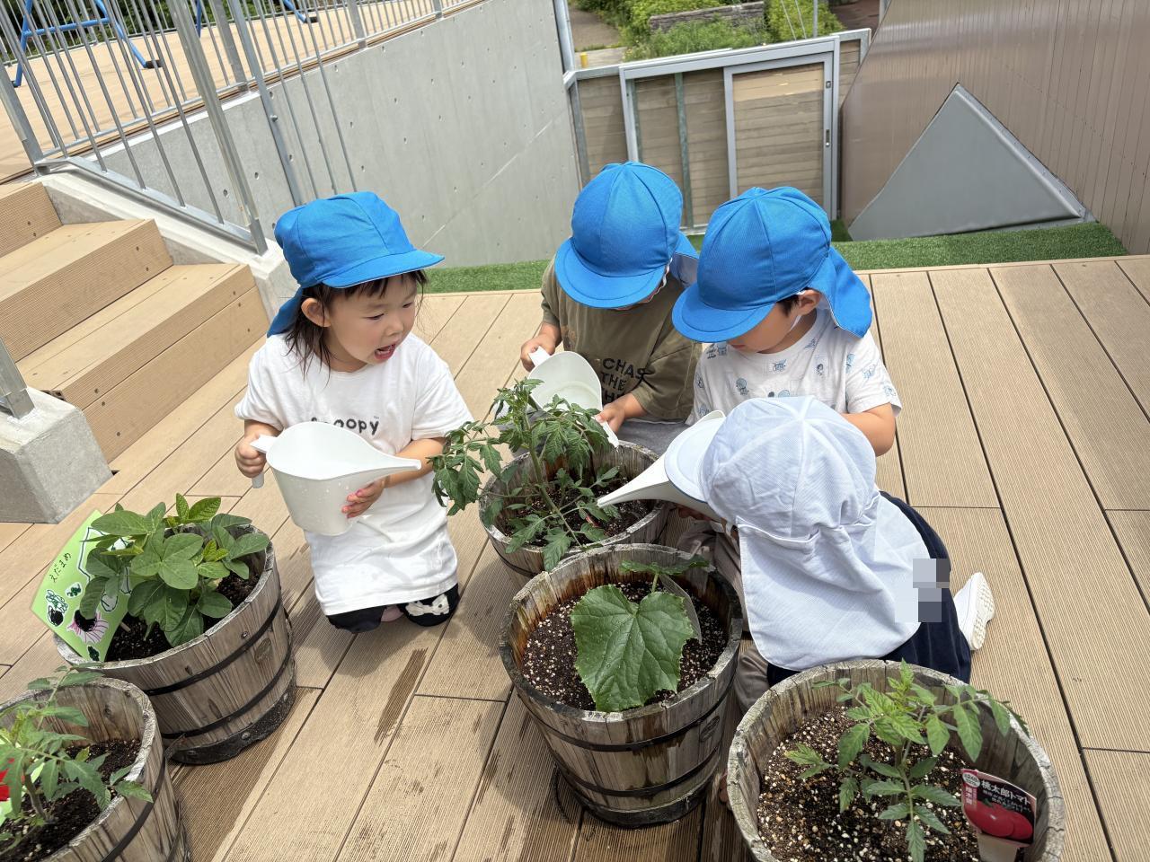 「水やりしに行く!」「大きくな~れ!」とみんなで一生懸命育てています🍅