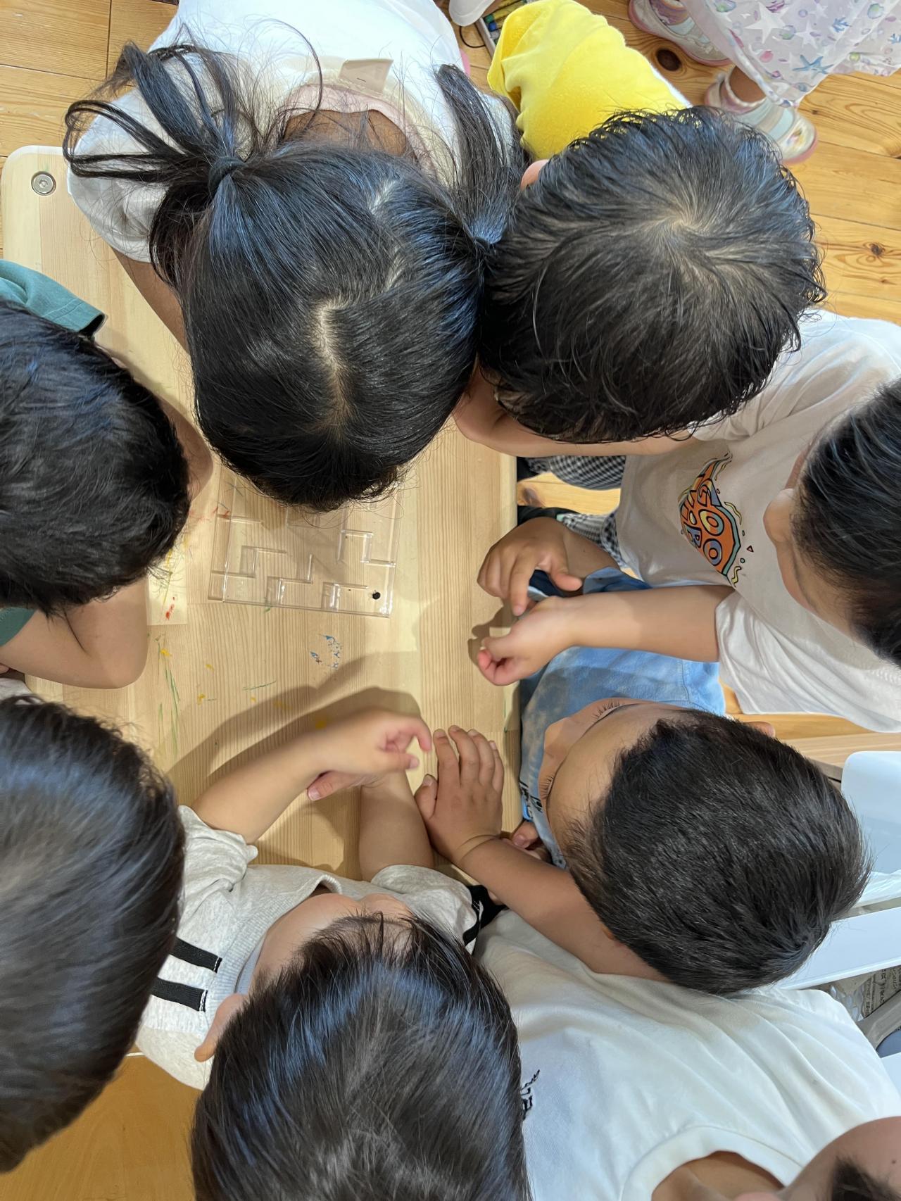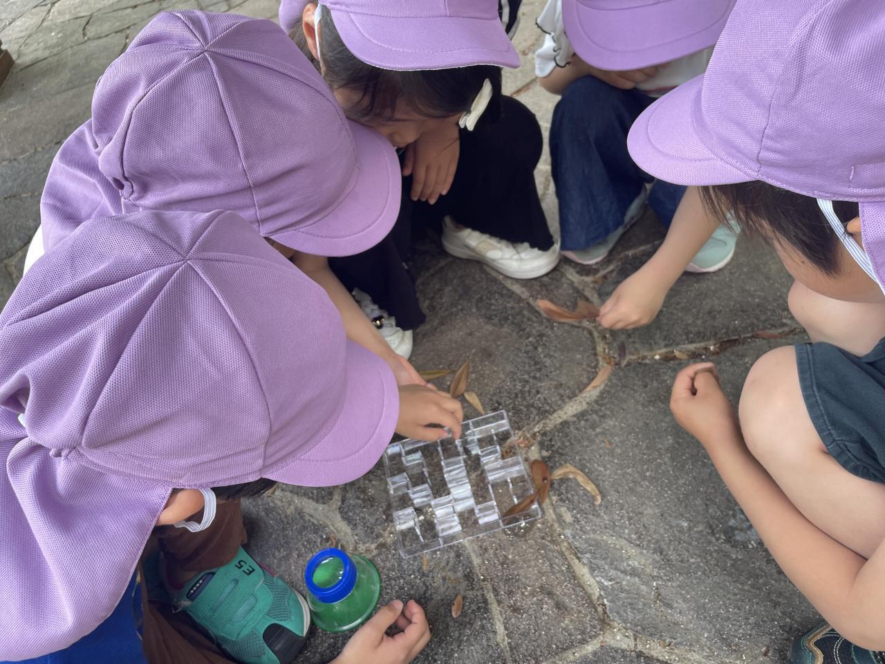 見つけたダンゴムシを手でそーっと拾い、ルーペで観察したり迷路をしたりして遊びました♪