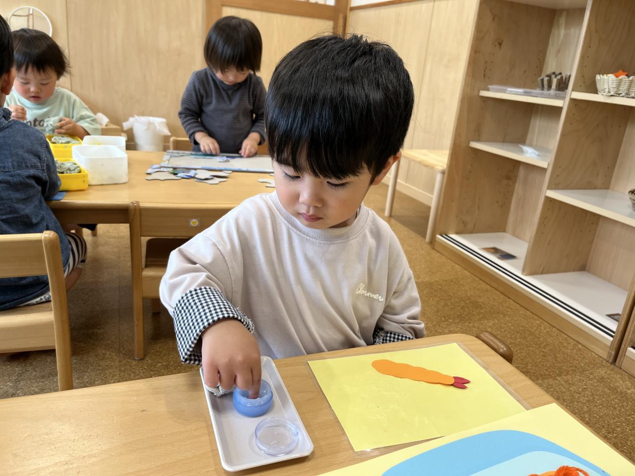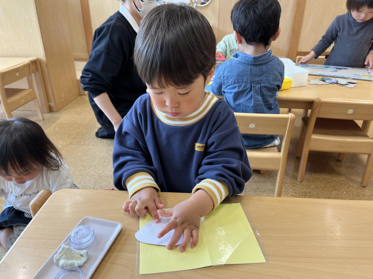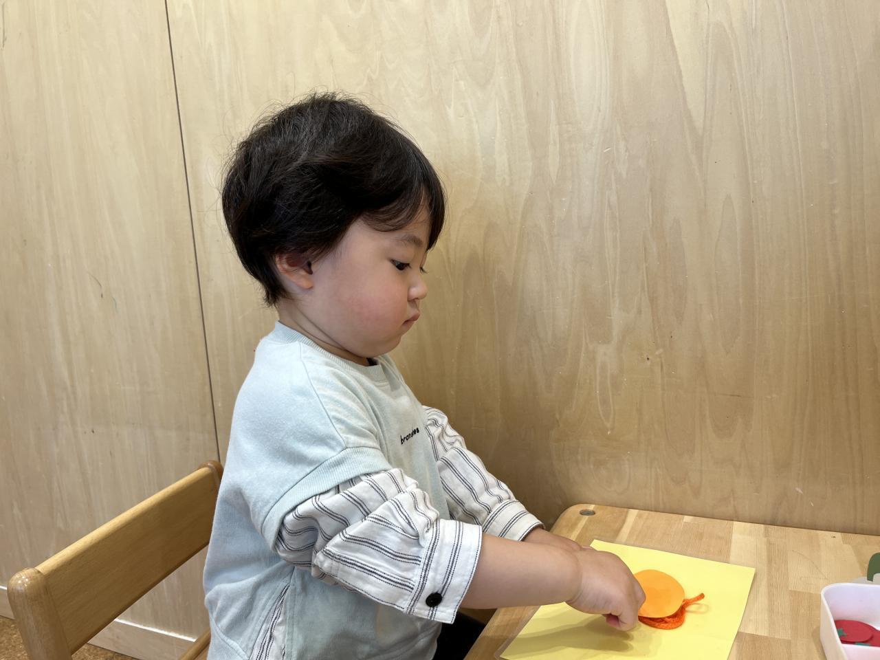 製作では指でのりを塗ったり、好きなお弁当の具材を選んだりしました!