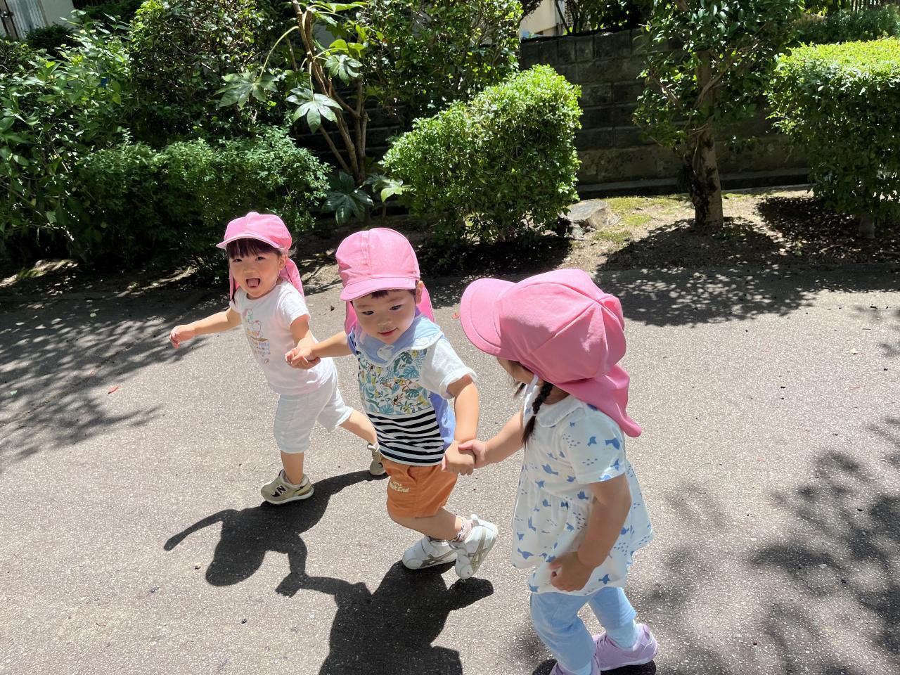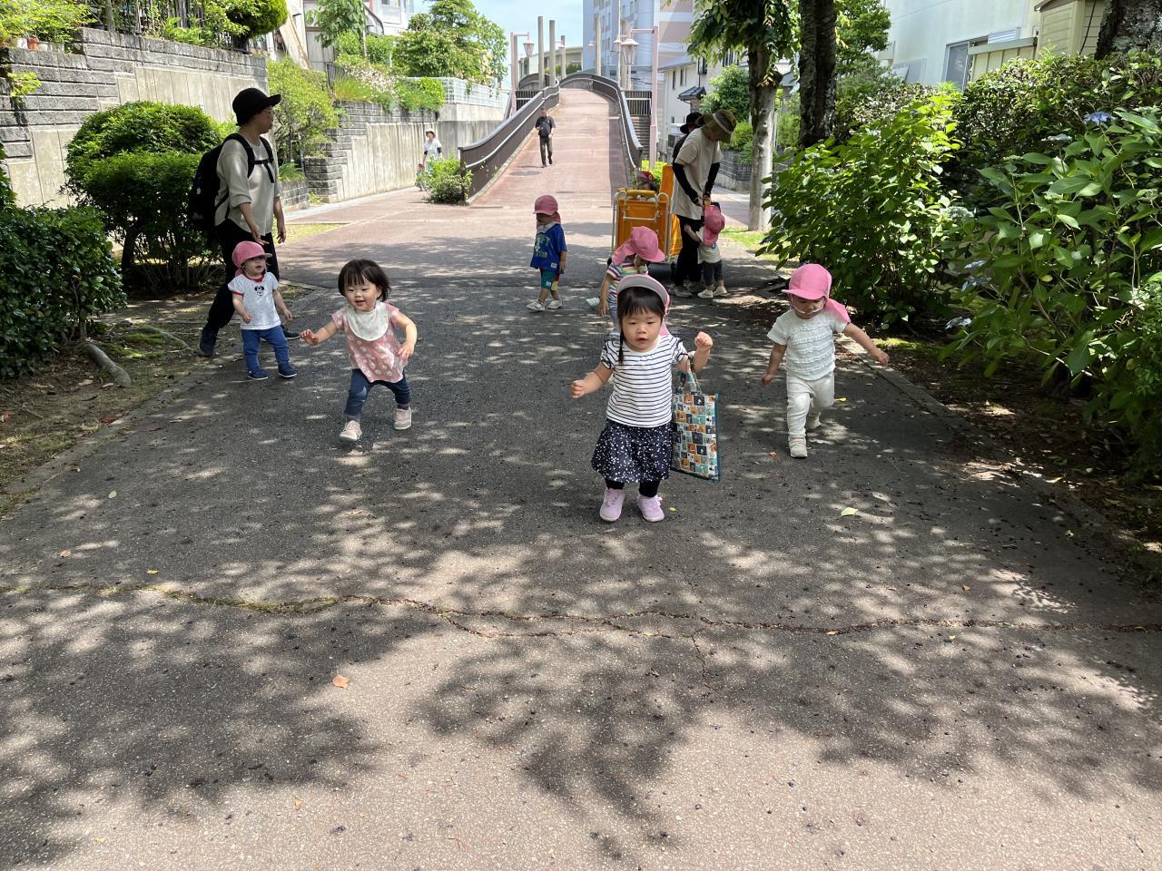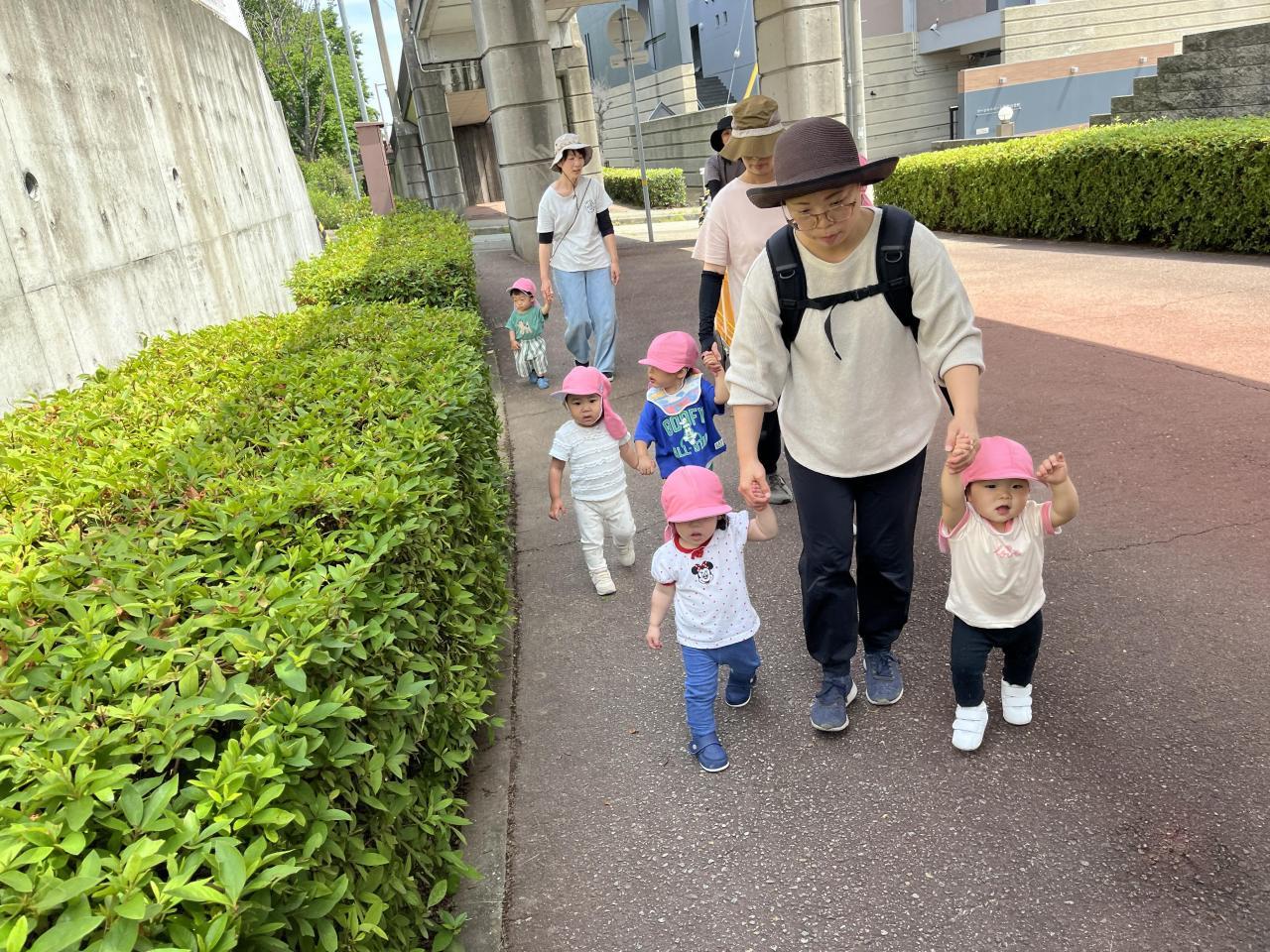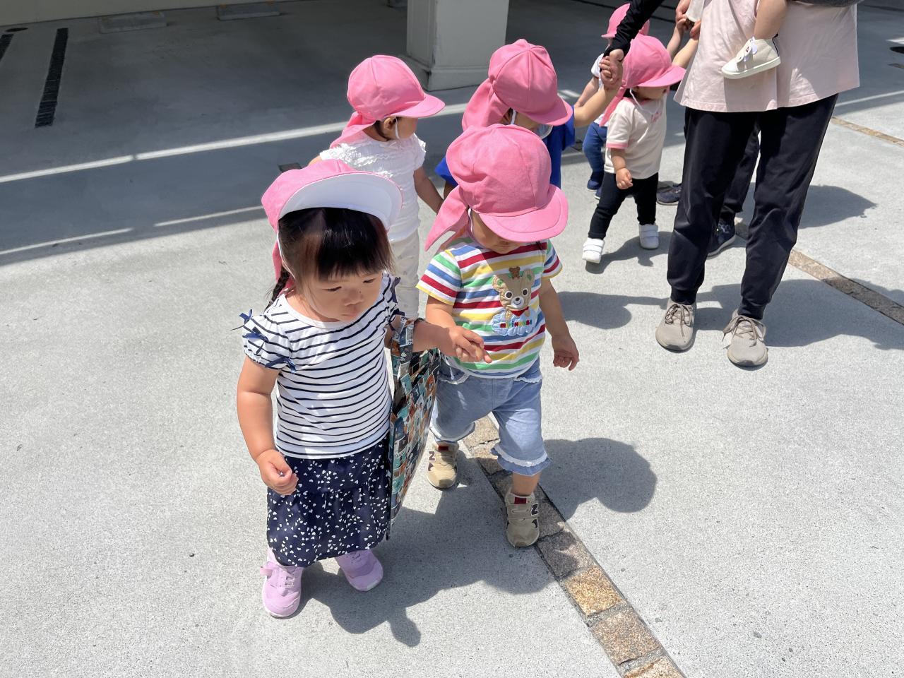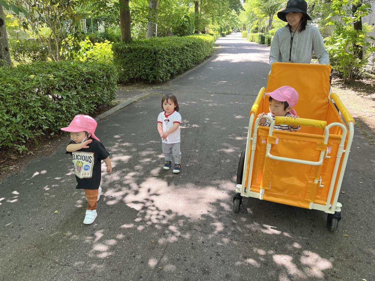職員やお友達と手を繋いだり、お散歩カートに乗ったりして