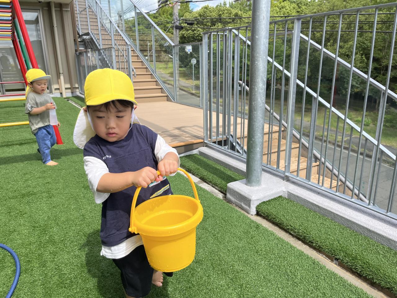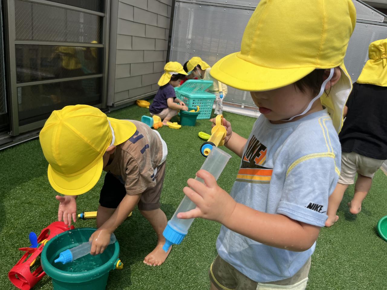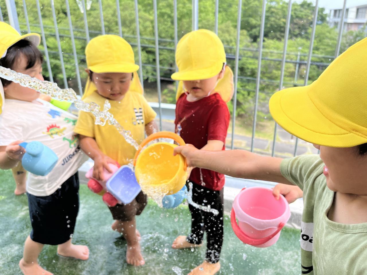 また、バケツやコップに水を運び、あけ移しを楽しんでいる姿もありました!