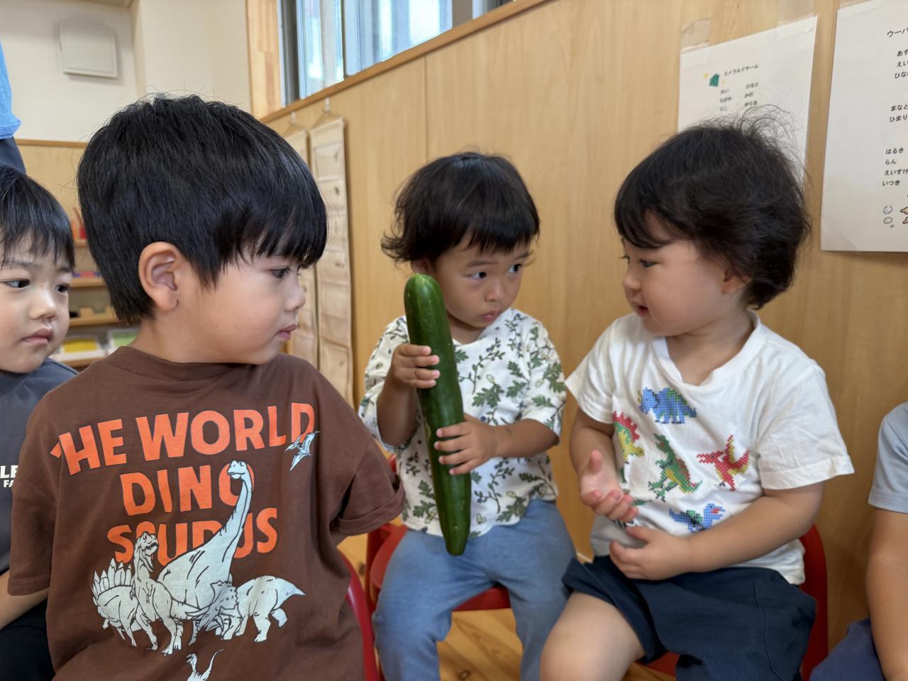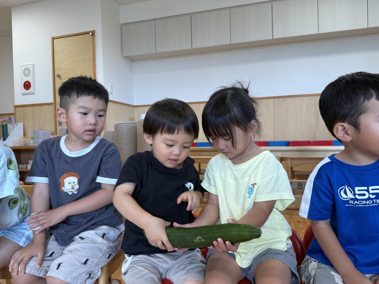 七夕の由来のパネルシアターを見たり、お供え物の野菜を実際に触ったりしました🍆🥒