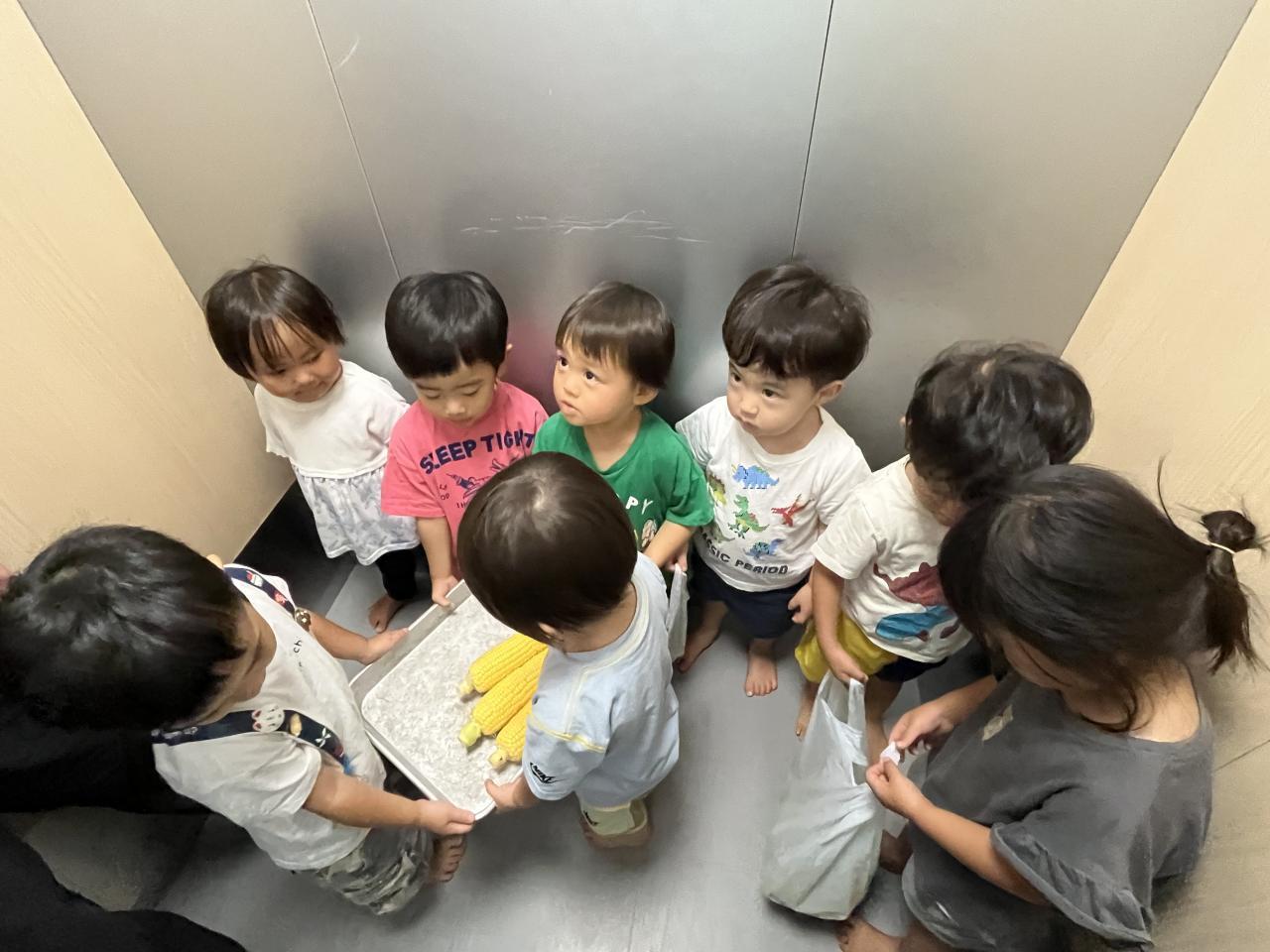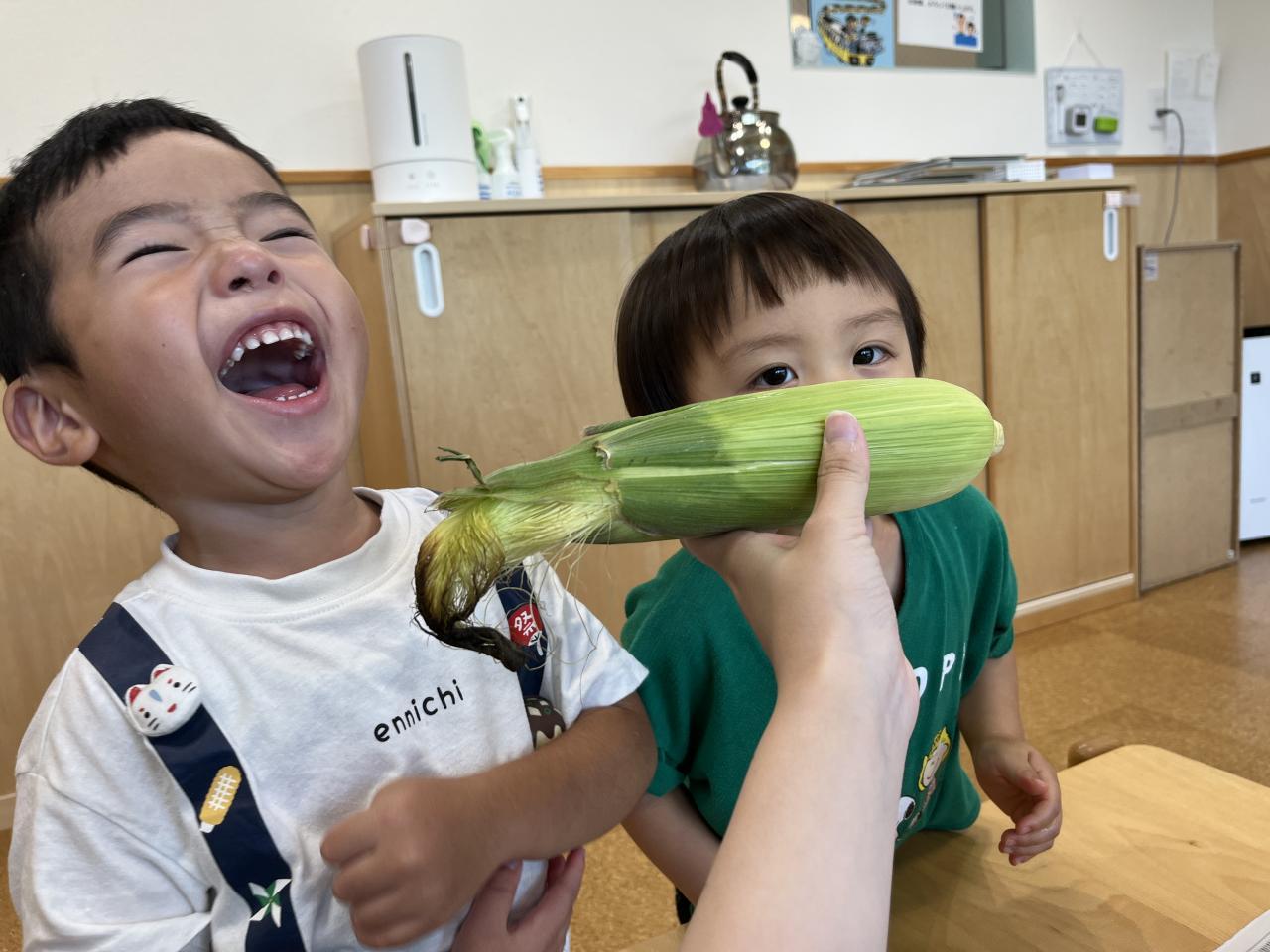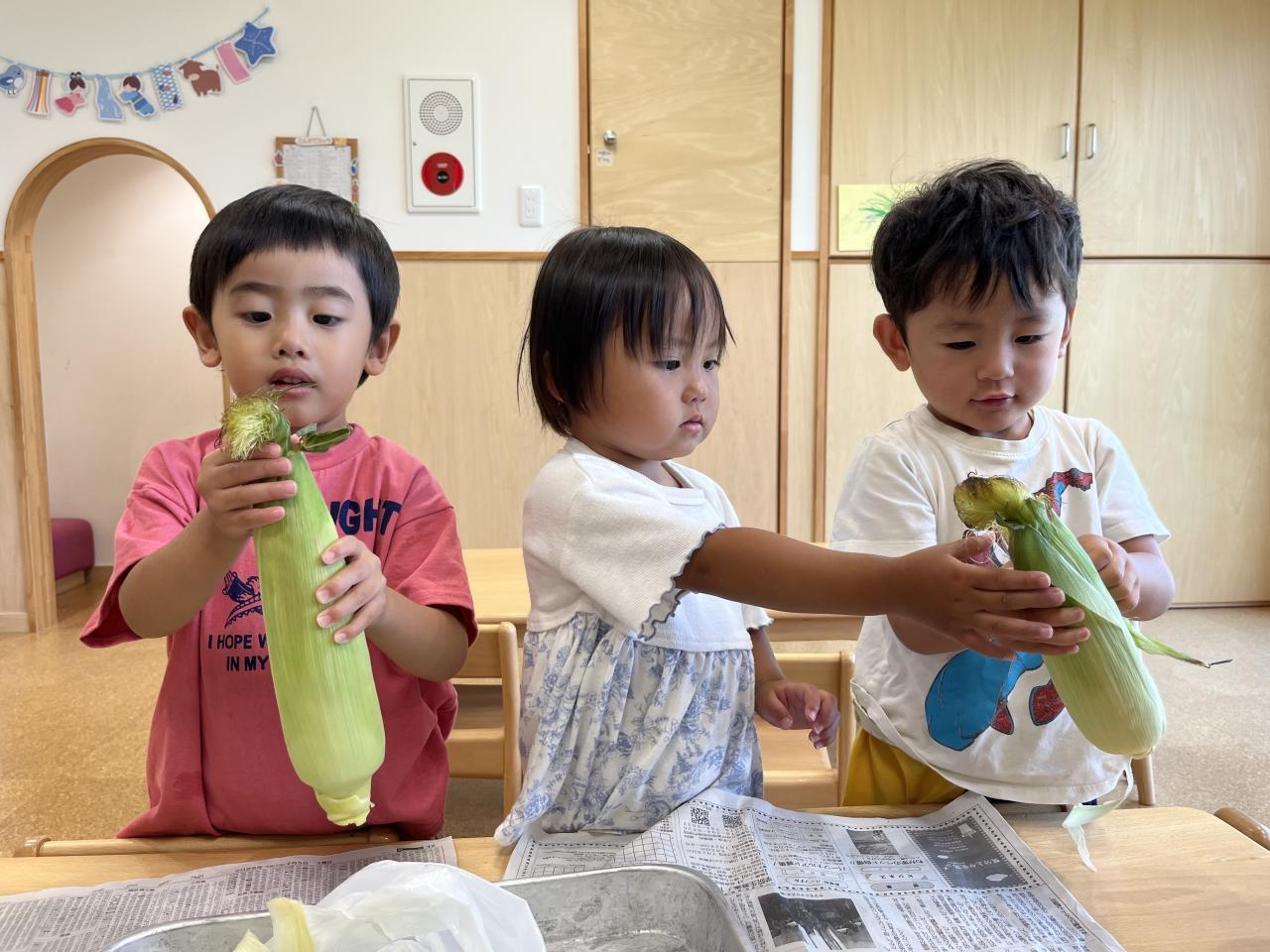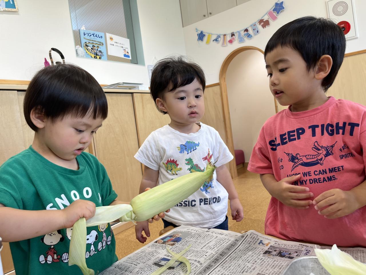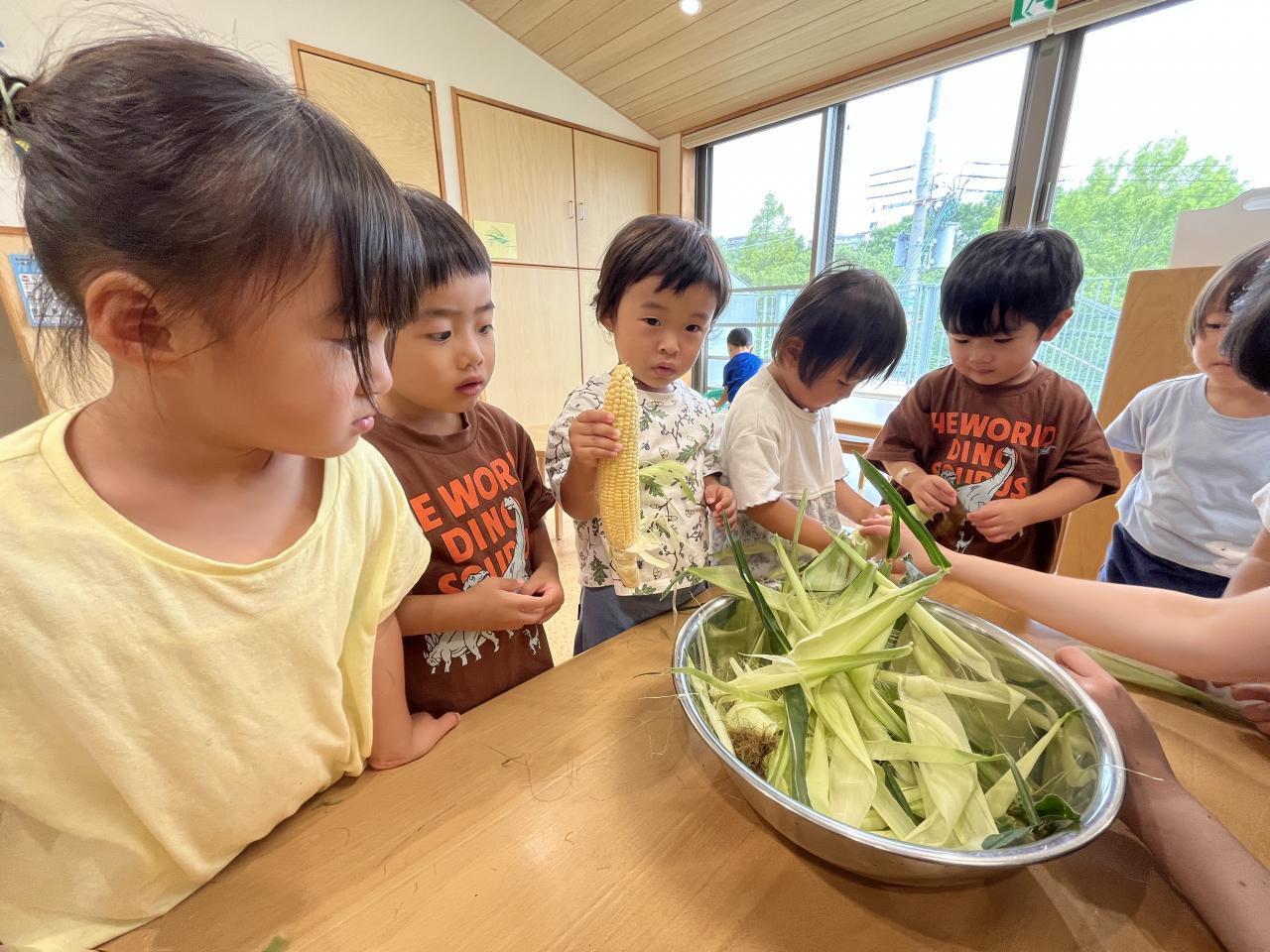 お友達と協力してとうもろこしの皮を剥きました!