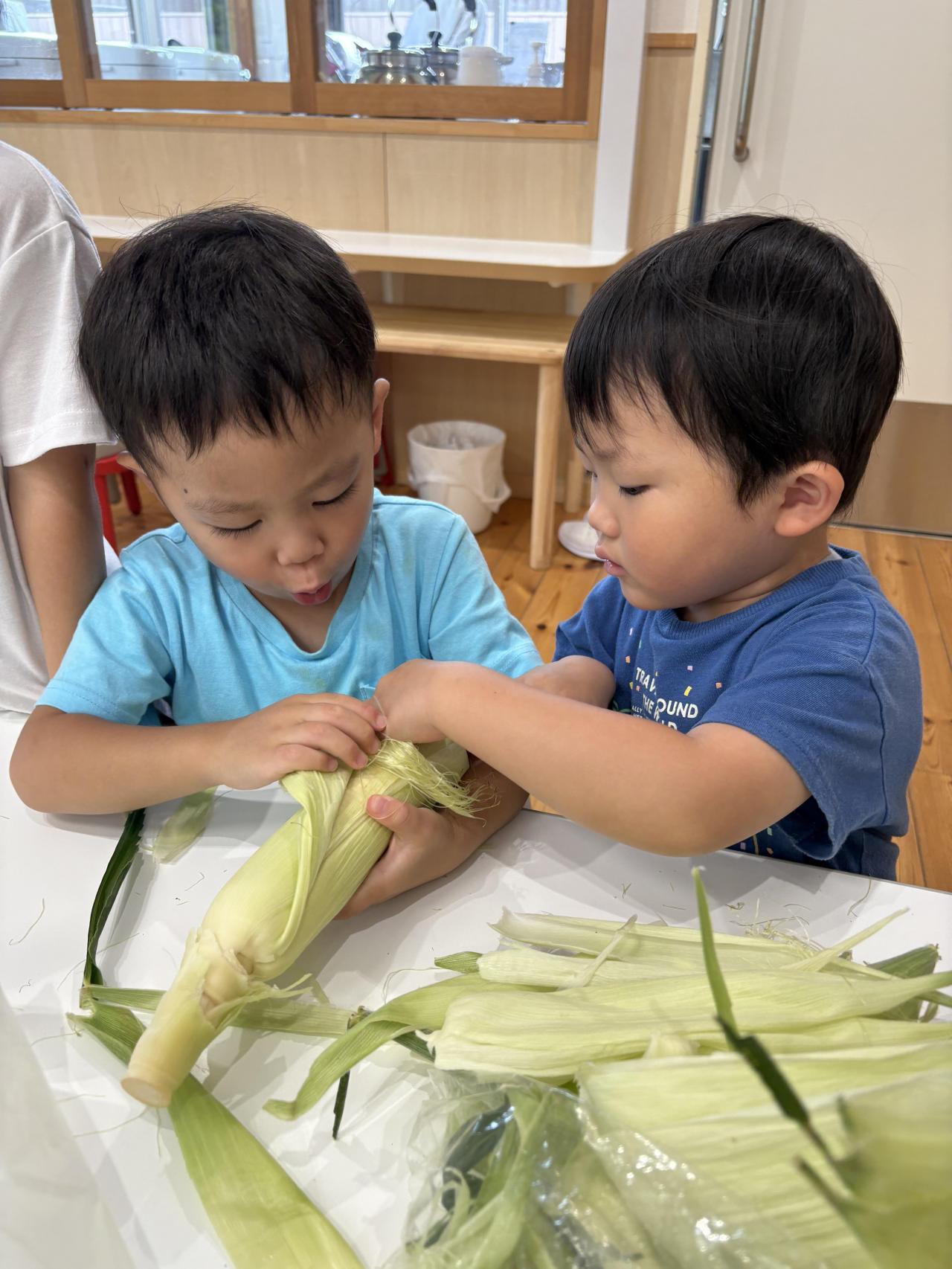 匂ってみたり、触ってみたりして調理前の食材に触れていました🌽