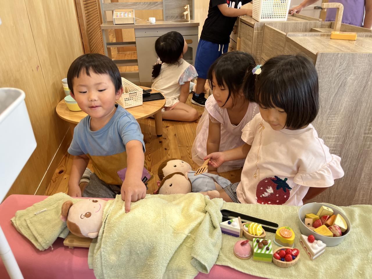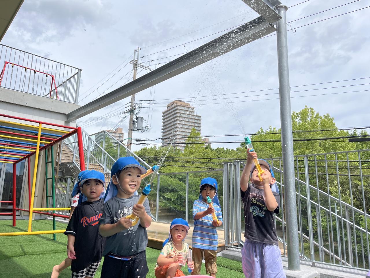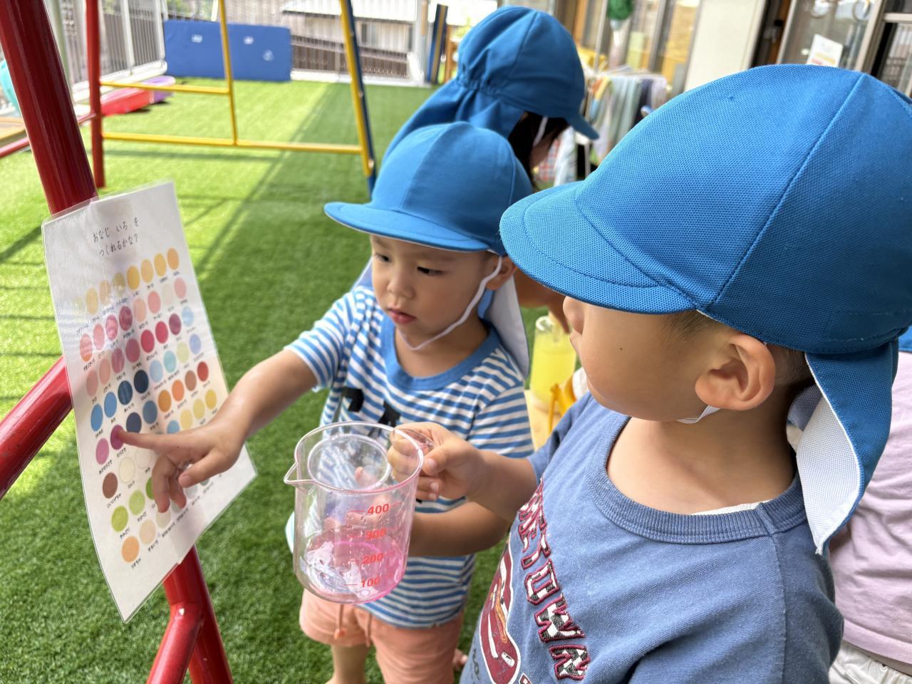 水鉄砲で友達と水の掛け合いを楽しんだり、濡れることが苦手な子は色水をしたりと