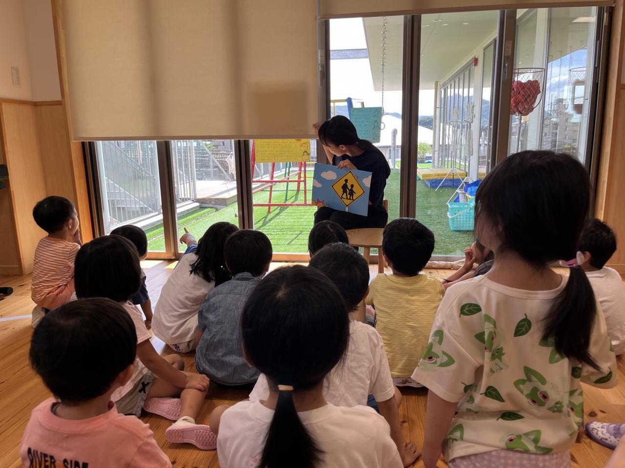 交通安全集会では身近な標識や傘の正しい持ち方についてのお話を聞きました。