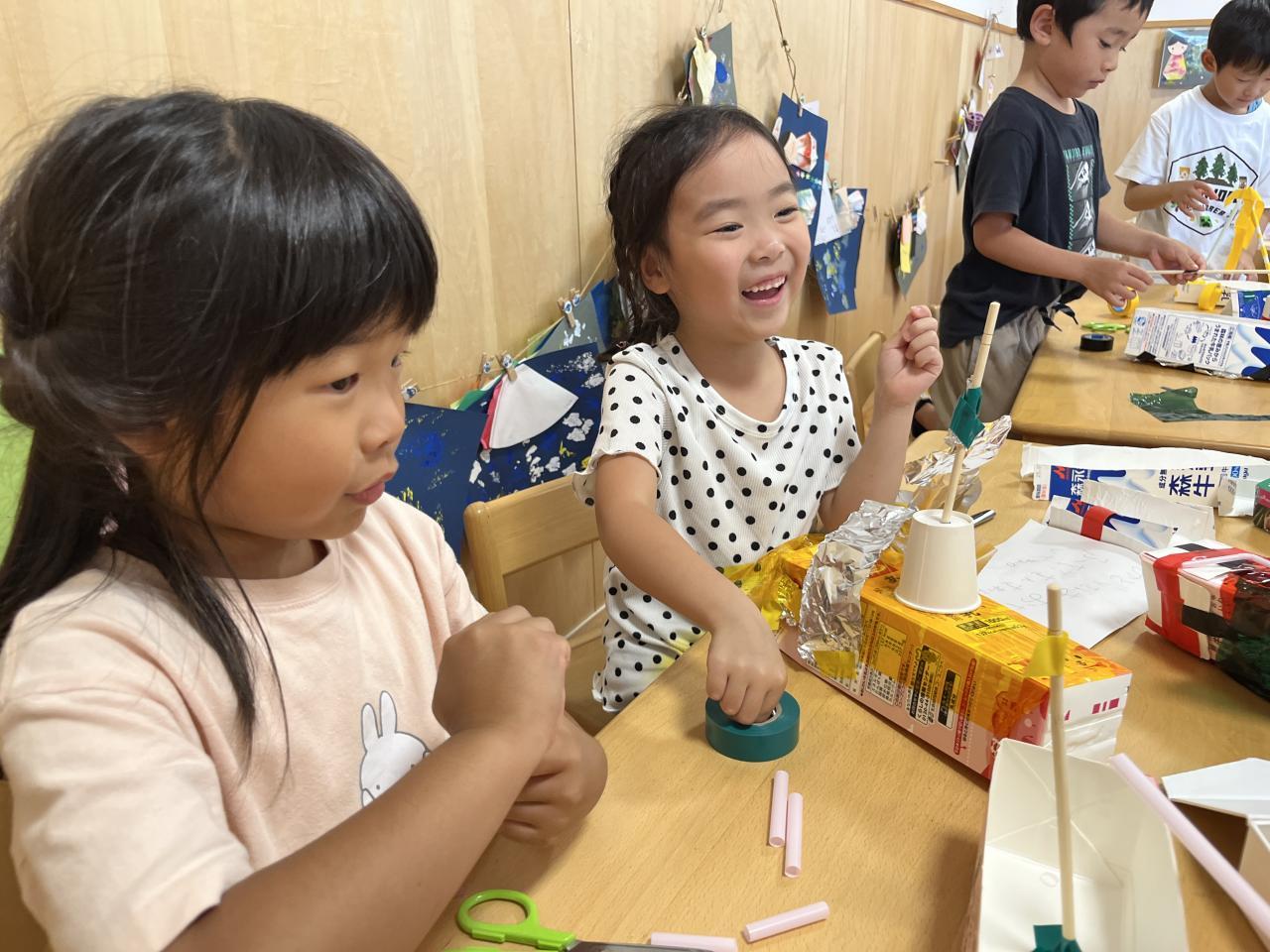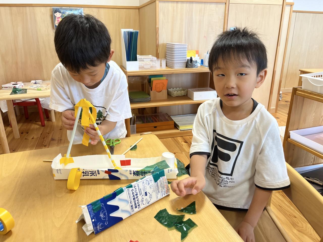 牛乳パックを思うままに切り、ストローや割りばし等を使いながら、牛乳パック船を作っていました!