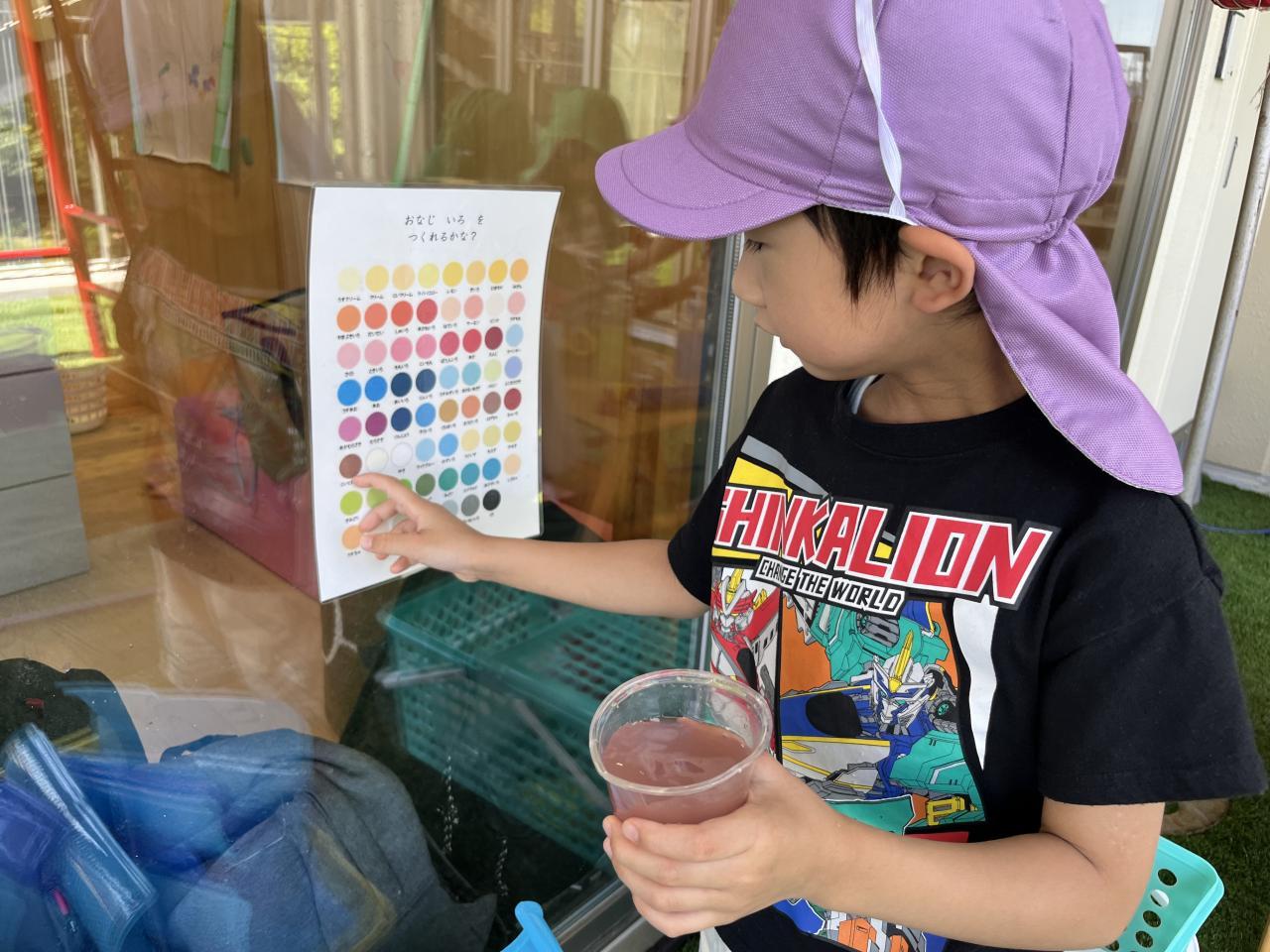 水鉄砲やバケツで友達と思いっきり水をかけあうこともあれば、的を作って狙いを定めて発射したり、水が止まってしまっているところを探しながら水路を作ったり、作った色と色表を見比べながら色への興味を深めたり。