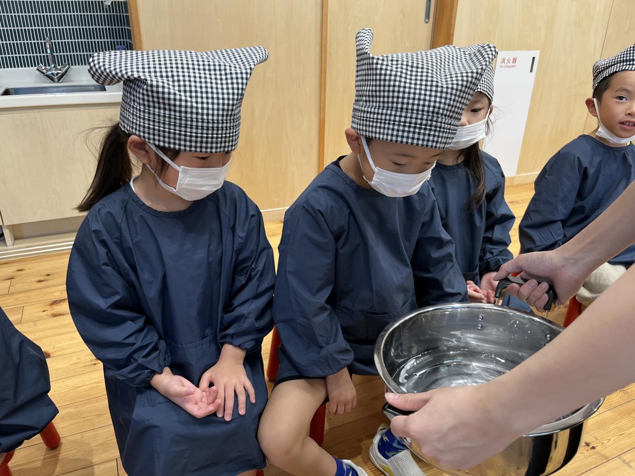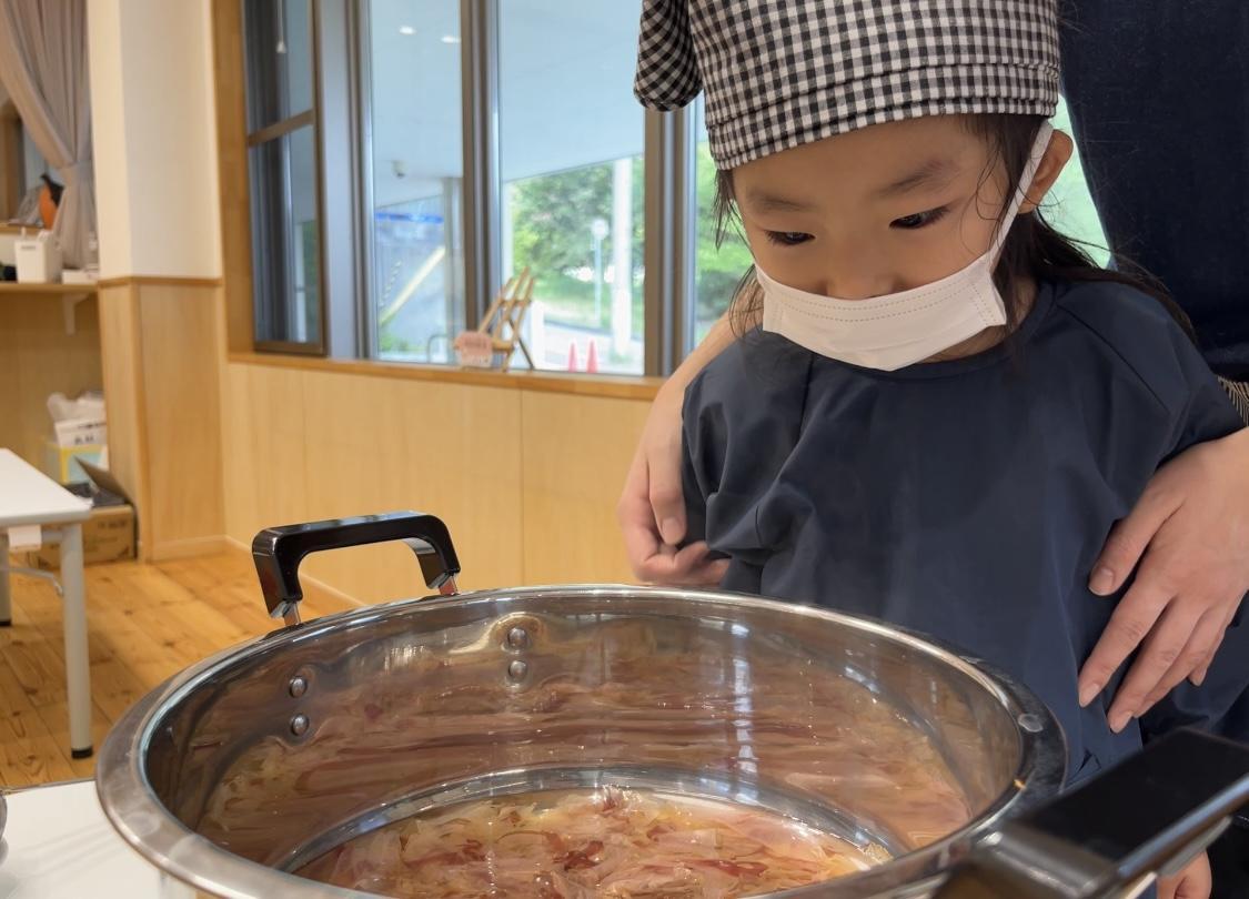 「出汁ってなに?」とお話を聞いた後、鰹節を使って出汁を取りました。