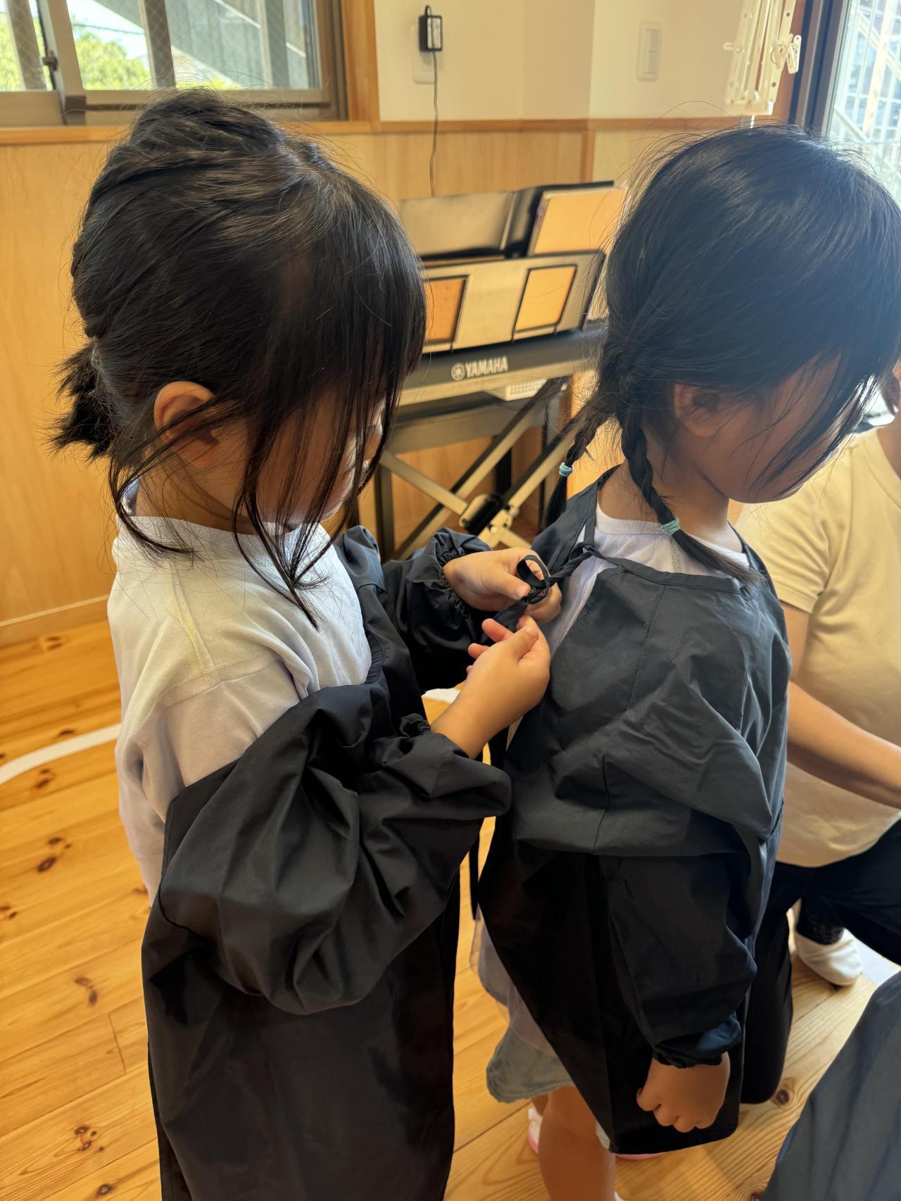 すると4人のお友達が「やりたい!」と子ども同士で協力しながらエプロンをつけ、