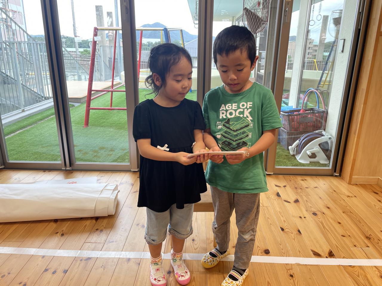 ペアの子に「せーのって言うんだよ」「マイクは最初前に向けとくんだよ」と子どもたちで助け合っている姿も沢山見られました☺️