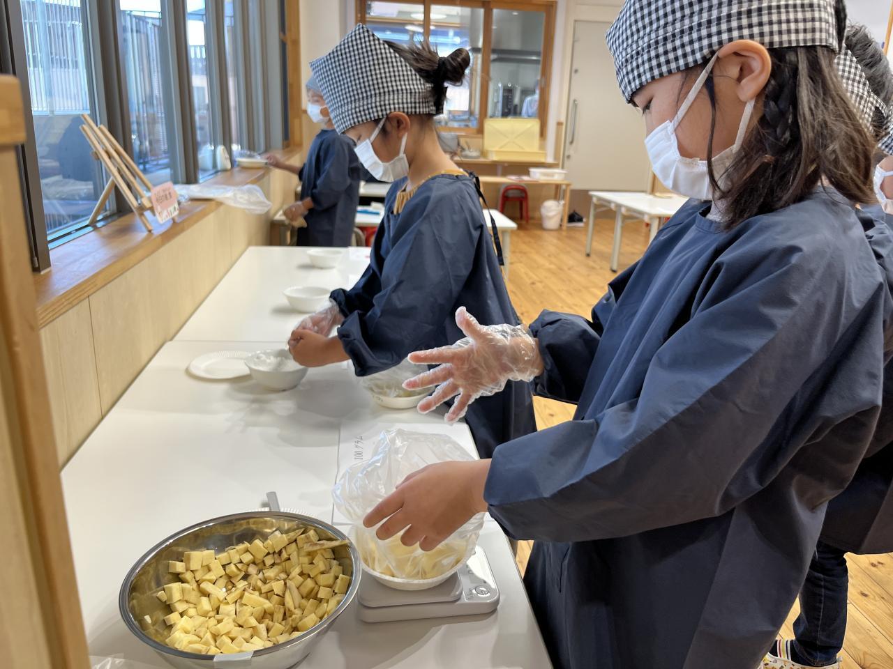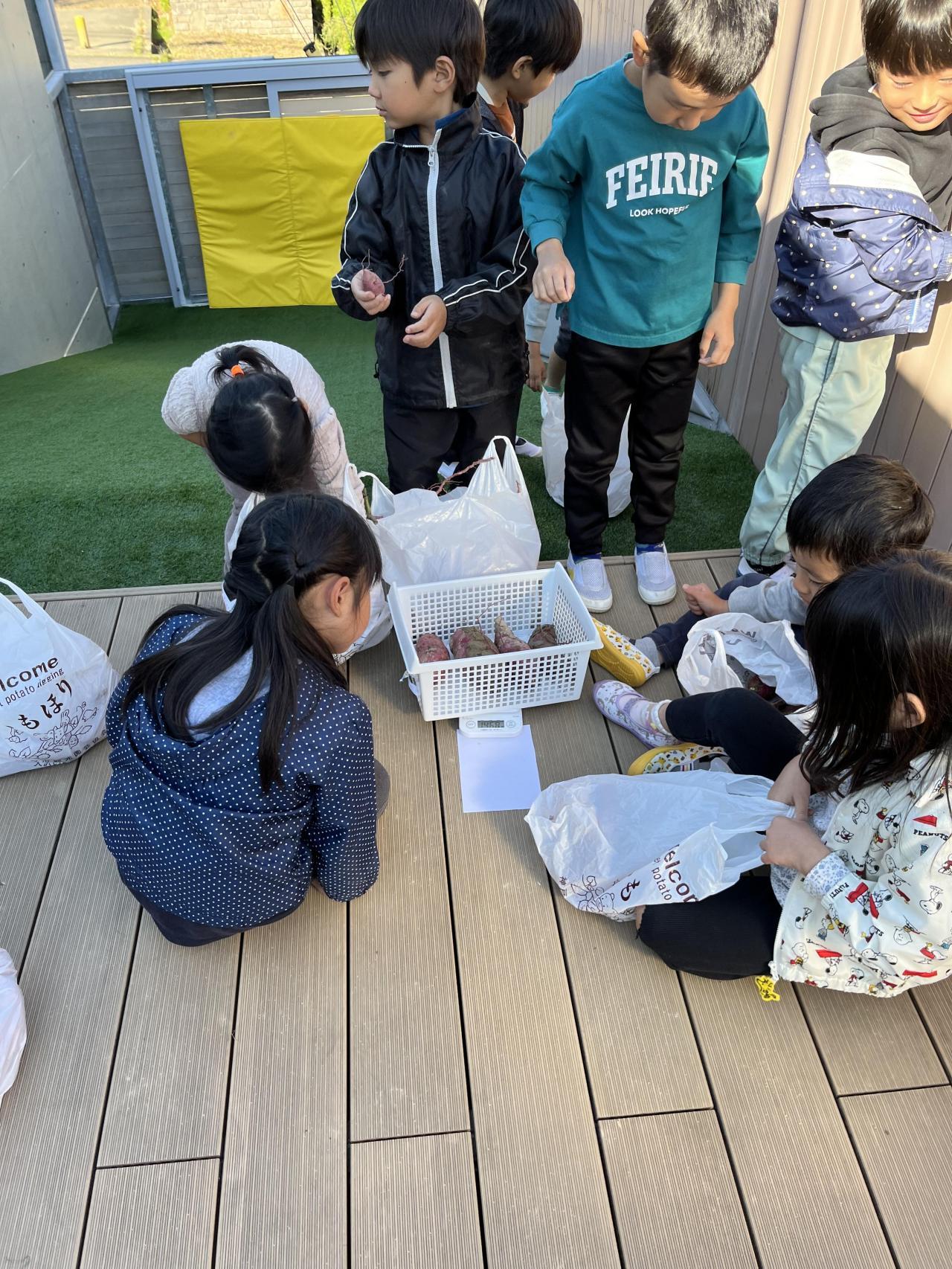 紫さんが大きさや形を見比べながらグラムを測り、クッキングに使うさつまいもを決めました!
