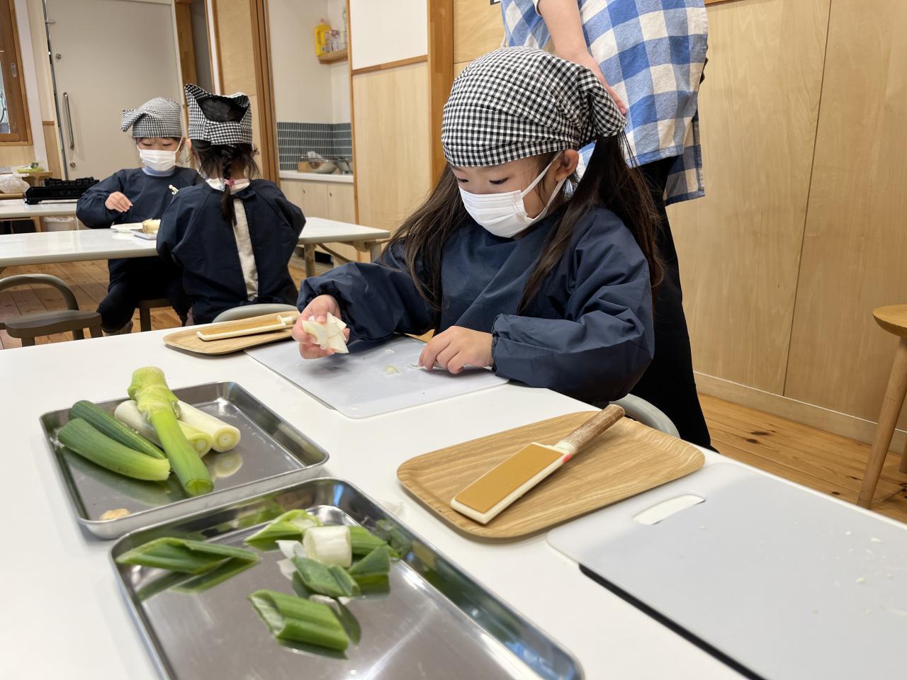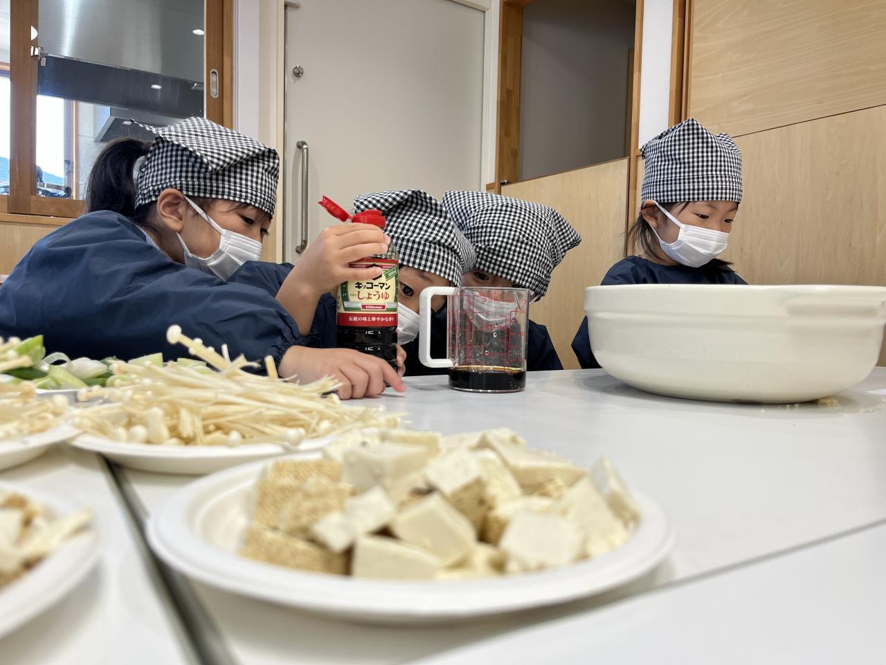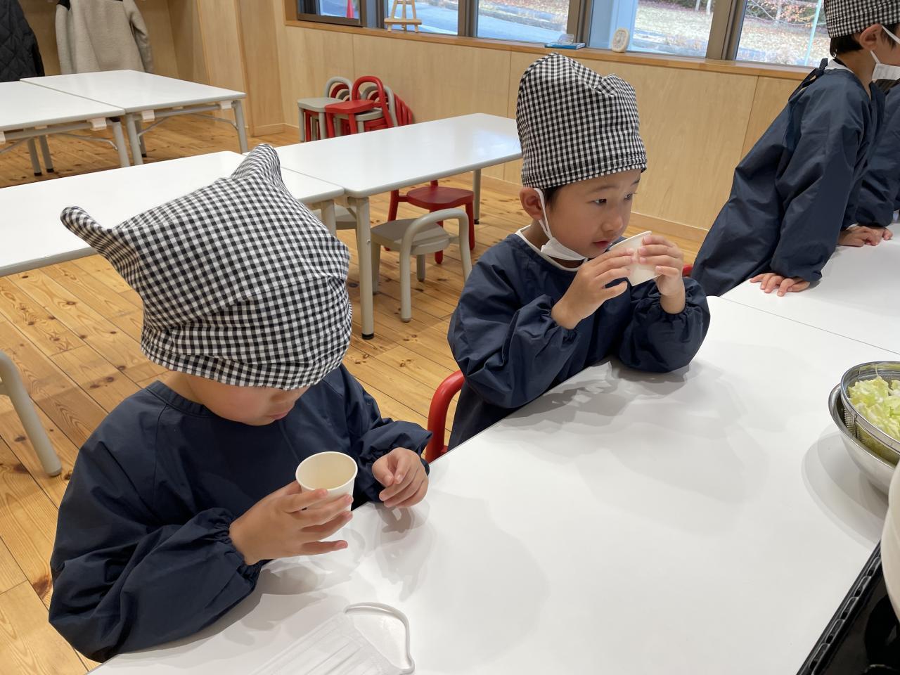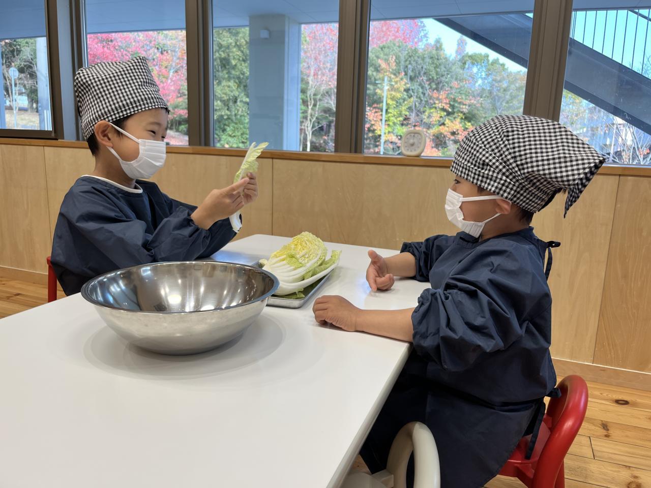 と、友達と話しながら、白菜とえのきをちぎったり、さいたりすることを楽しんでいました🥰