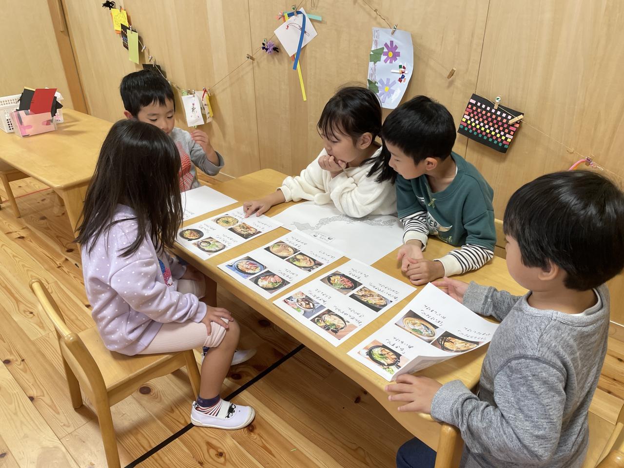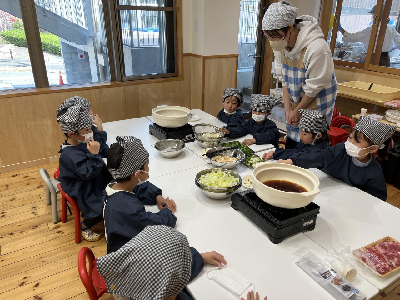 クッキングをする前に、5歳児で日本地図に色を塗ったり、写真を見たりしながら、すき焼きについて調べると、「関西風」と「関東風」があることが分かりました❗