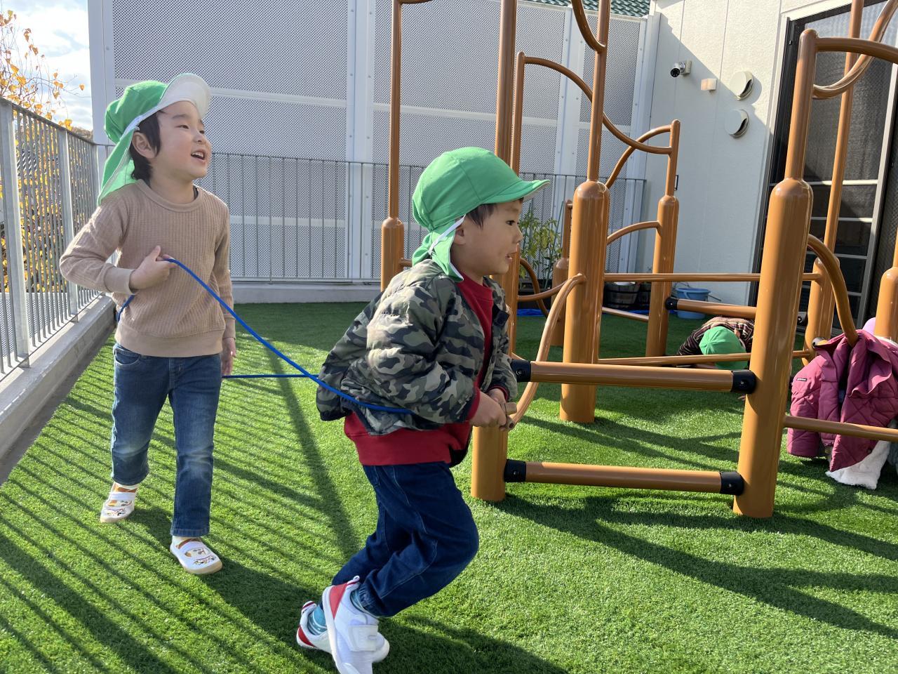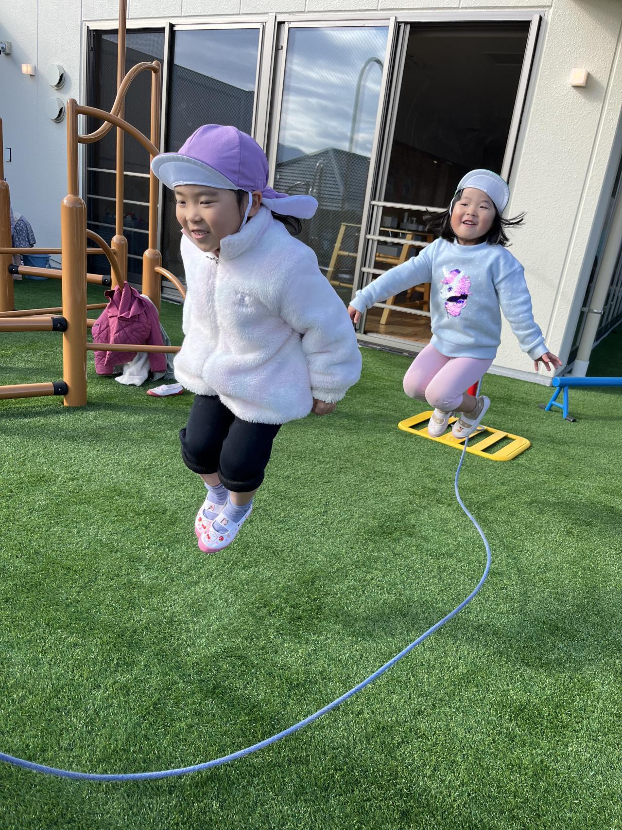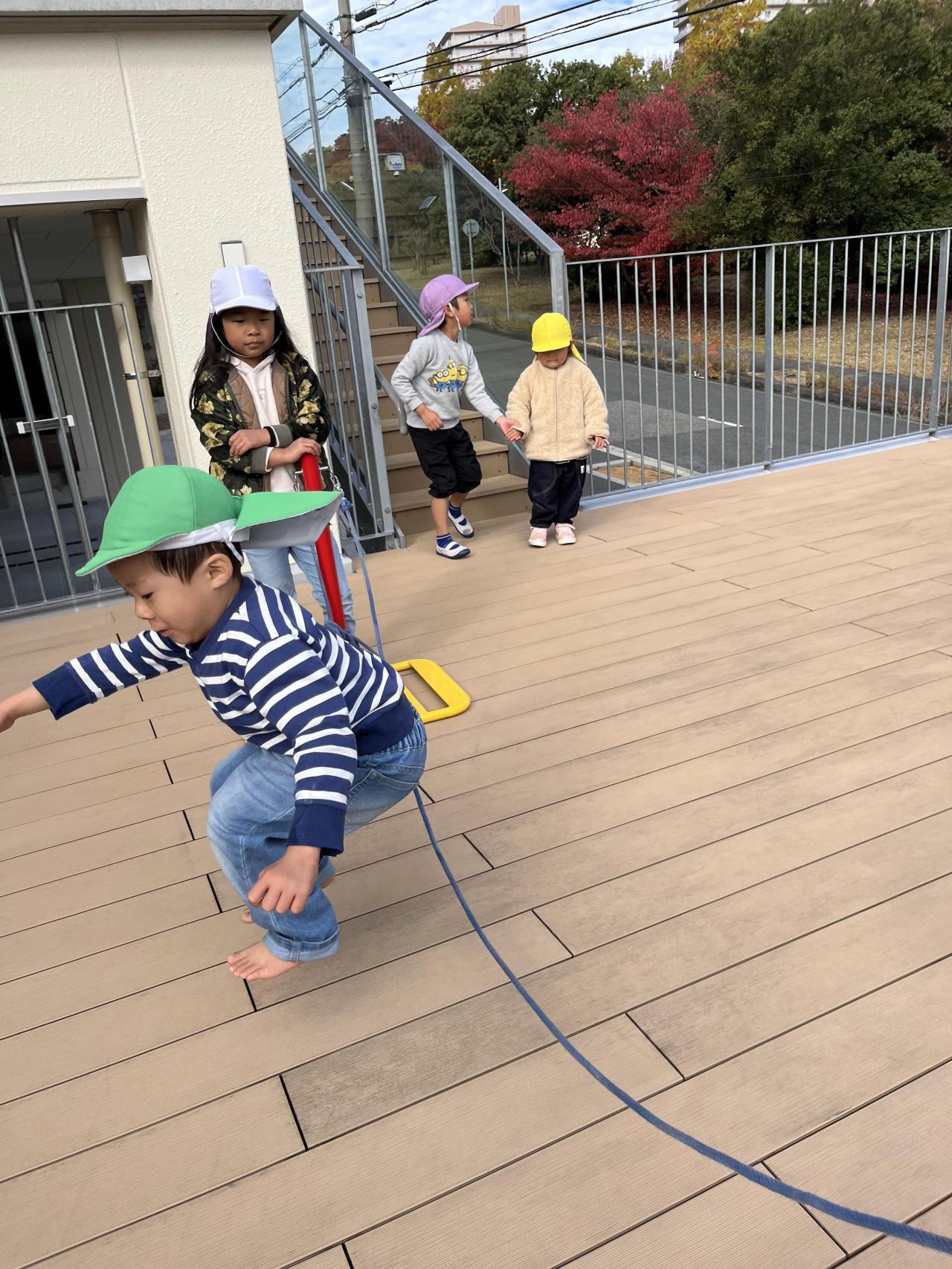身近に感じれるように縄跳びを電車に見立てて遊び方を広げたりして楽しみました🎵