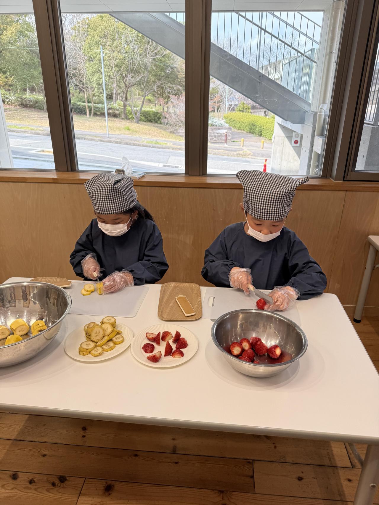 手袋をつけて切ったり、トッピングしたいものを紙皿に集めたりしました!