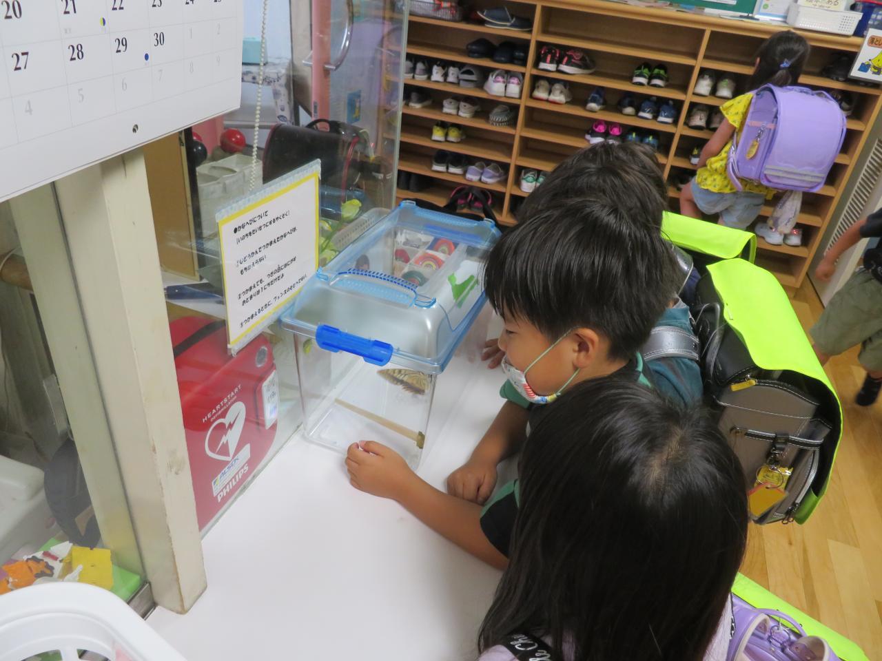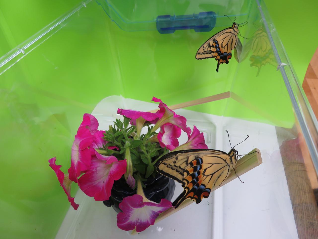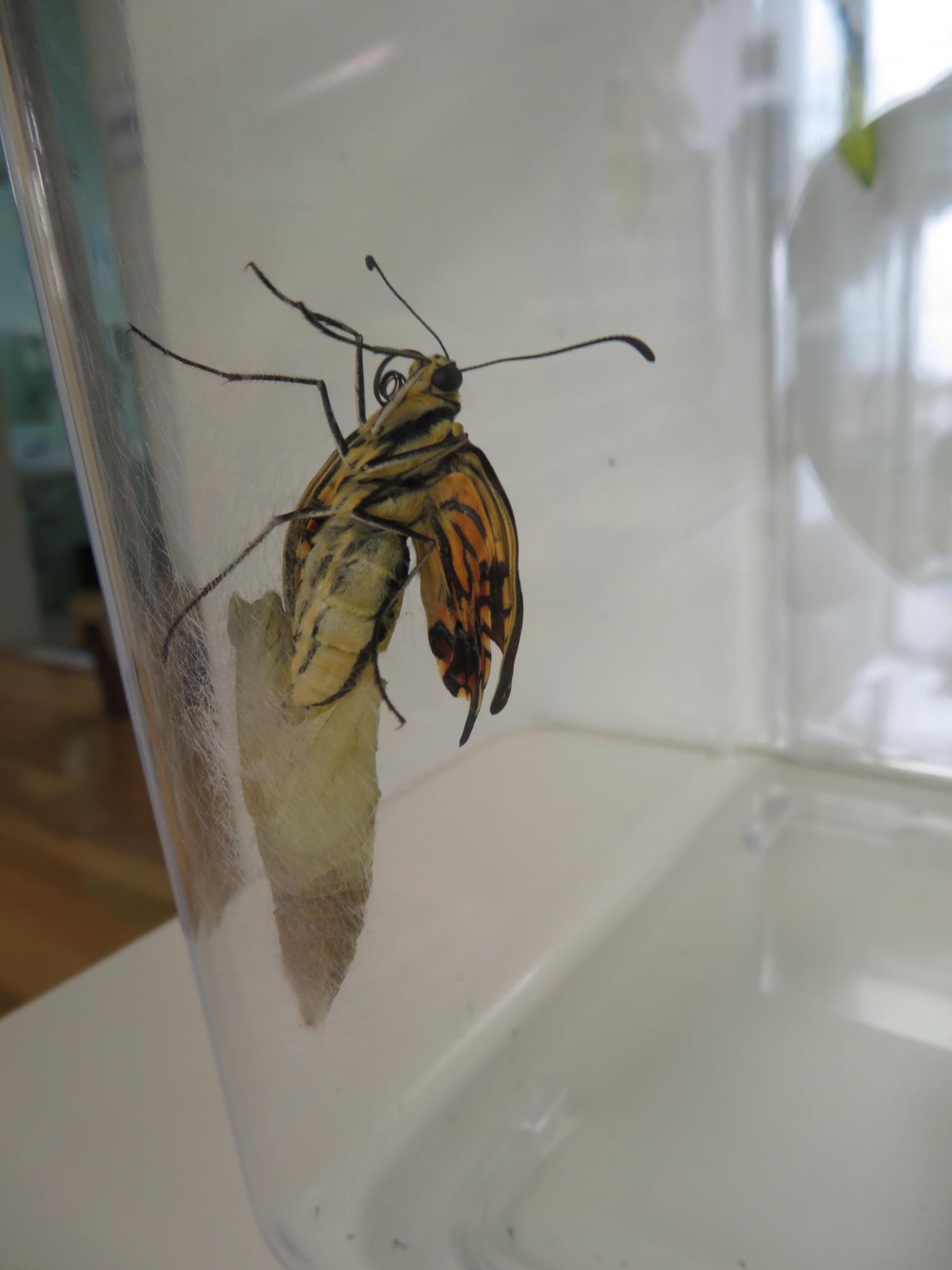にんじんの葉っぱについていた小さかった幼虫は、『キアゲハ』の幼虫でした。(“ガ”ではありませんでした( ;∀;))さなぎになって約2週間後、美しい蝶になりました~。