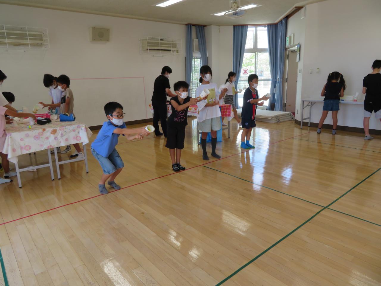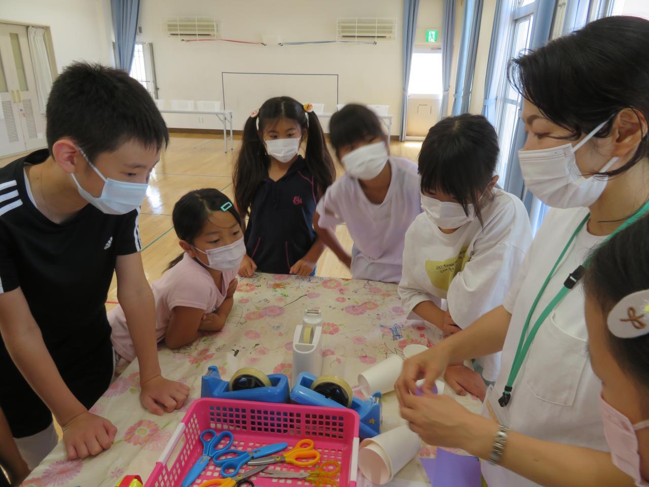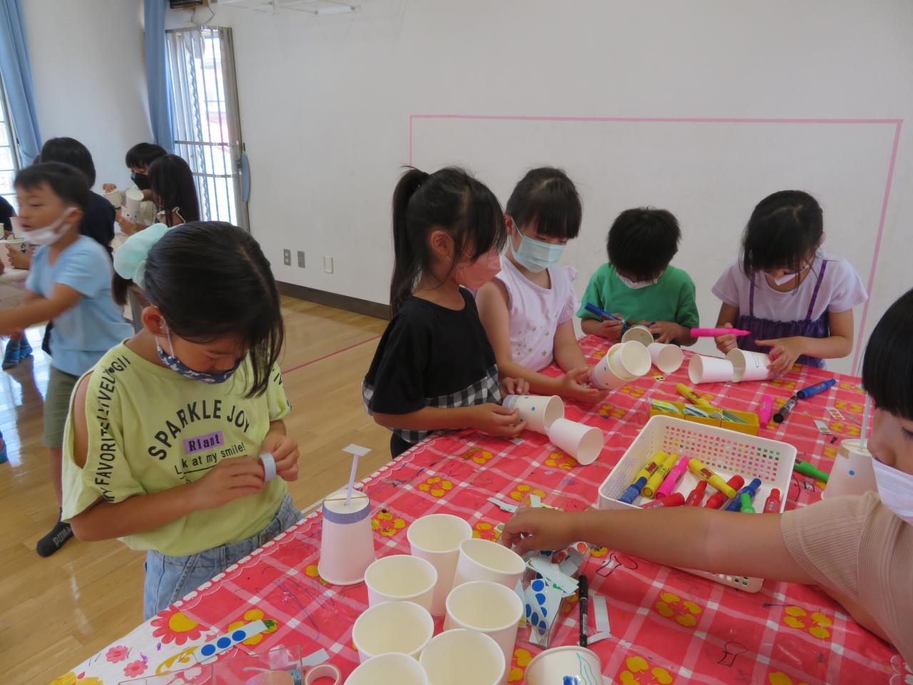 7月28日(木)10時30分から夏休み工作①『紙コップシューター』づくりを行いました。大きさの違う紙コップ2個とストローでシューターを作って、折り紙ボールをゴムの力で飛ばします。