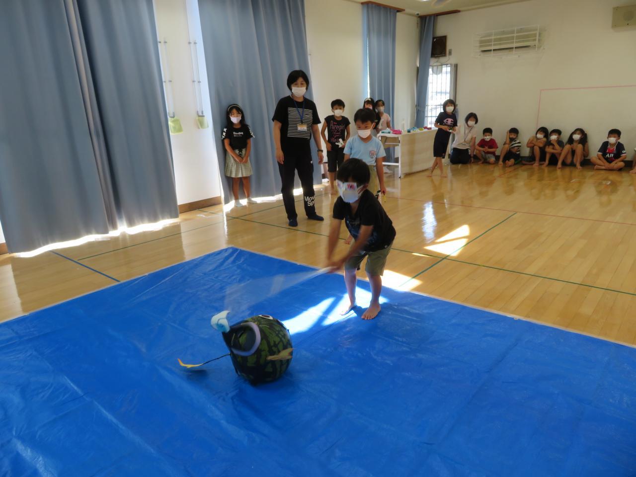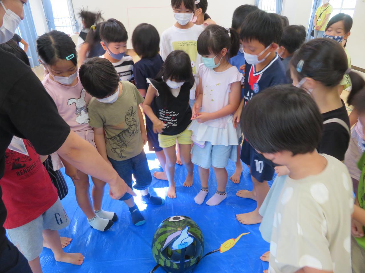 ハラハラドキドキ、ちびっ子剣士の目隠しメガネ姿がおもしろかわいく、見物のこどもたちも大盛り上がりのスイカ割りでした。
