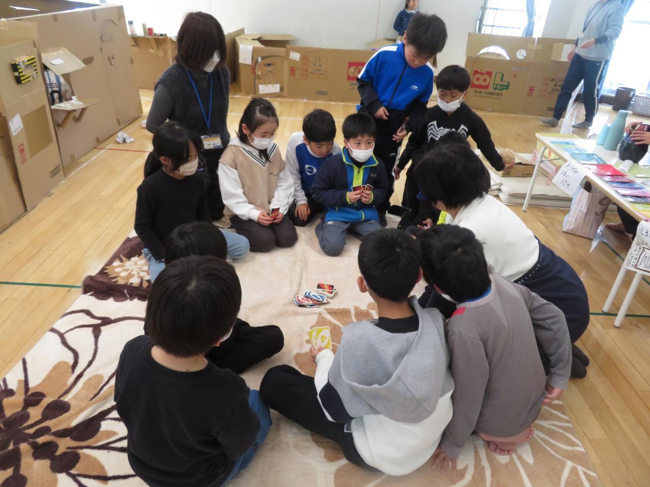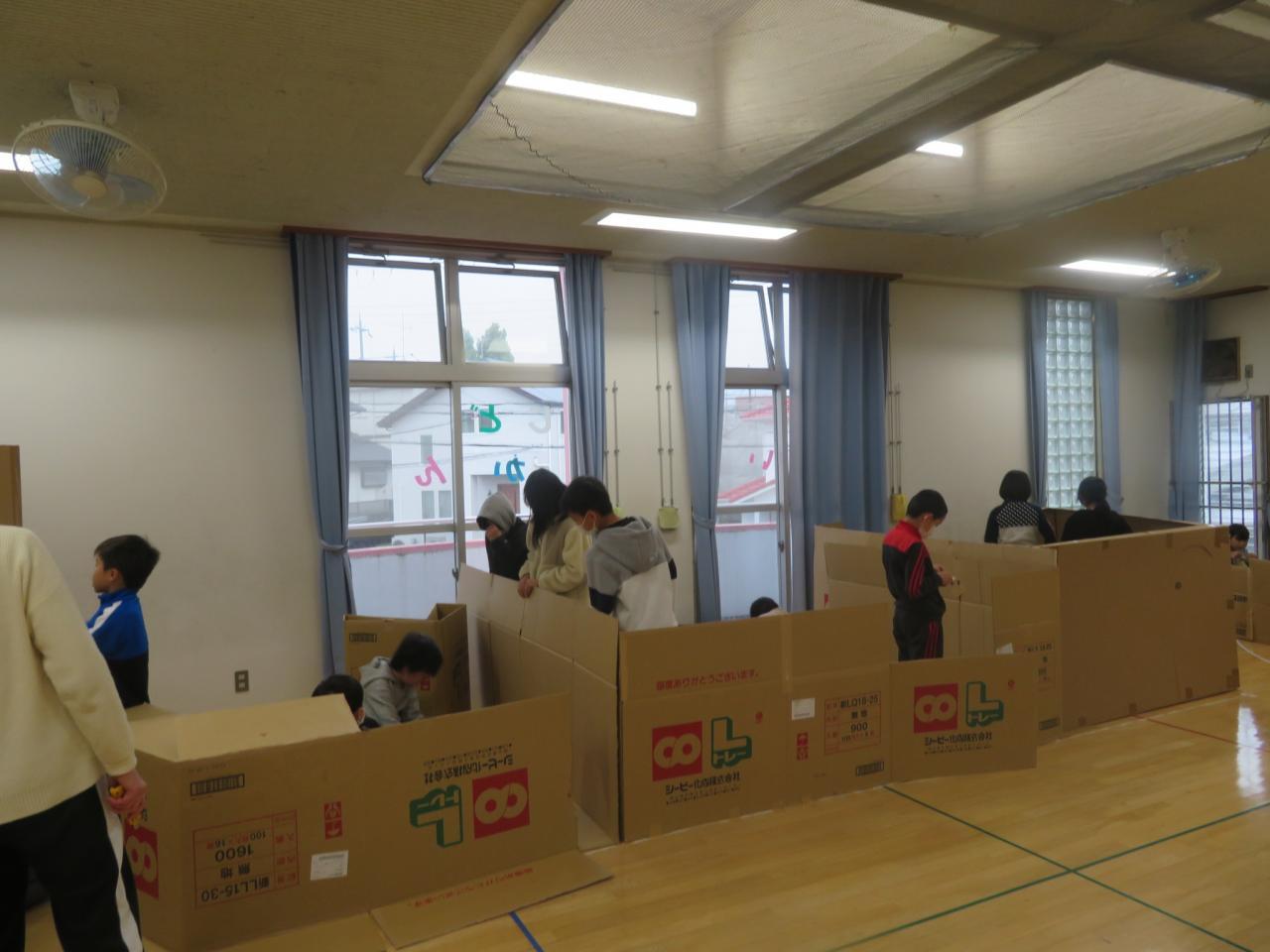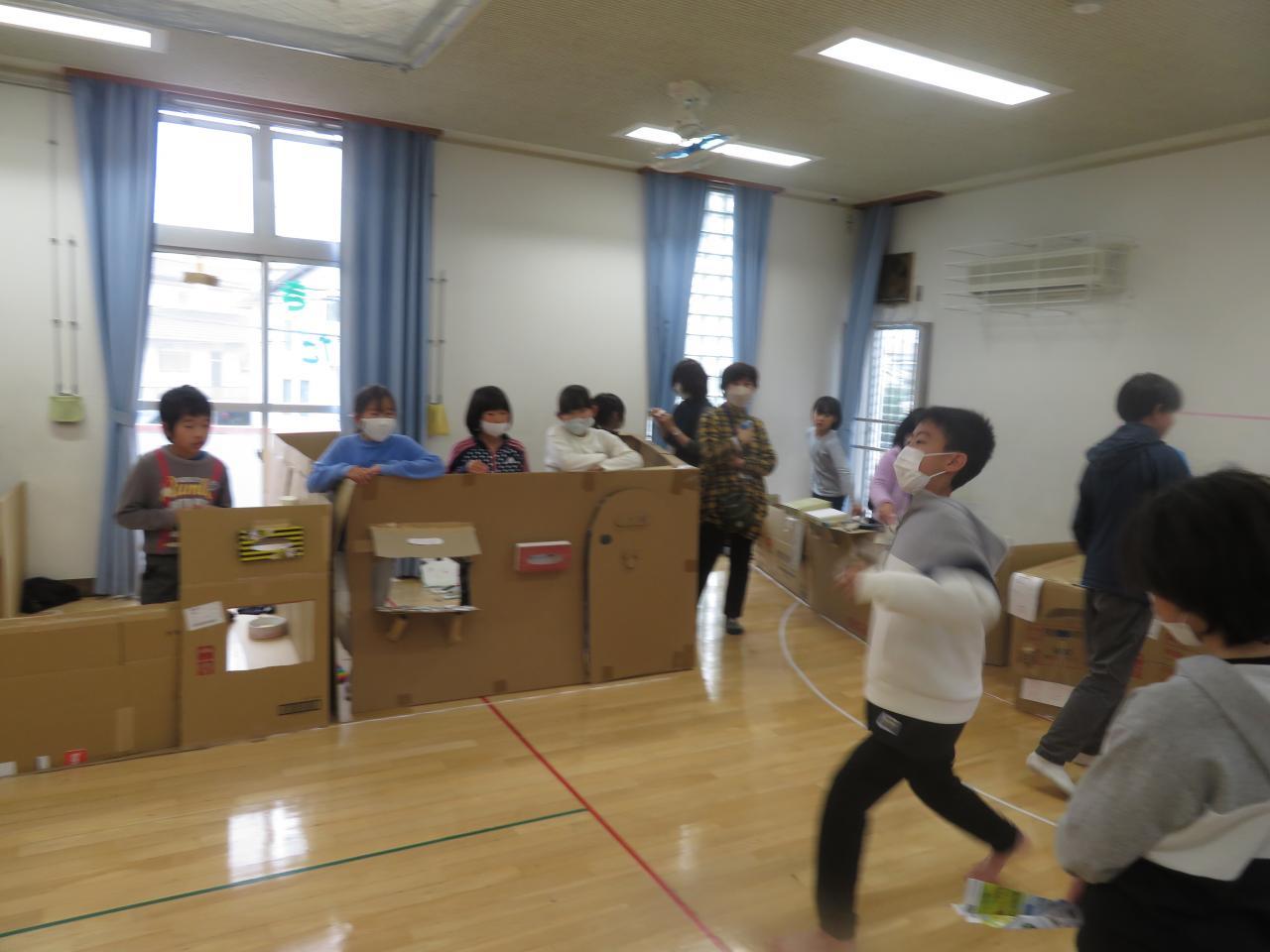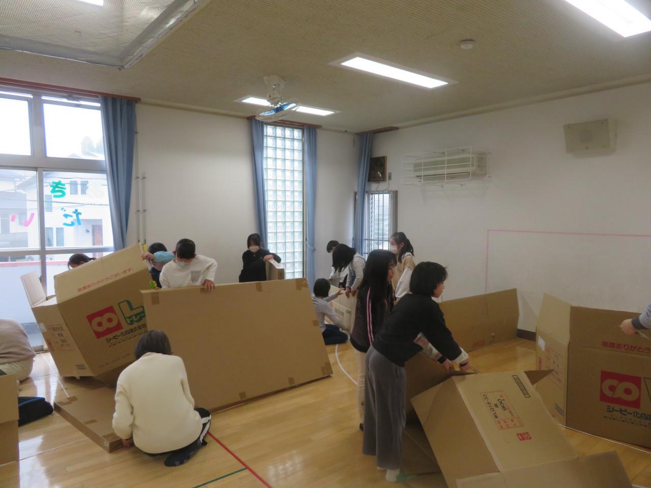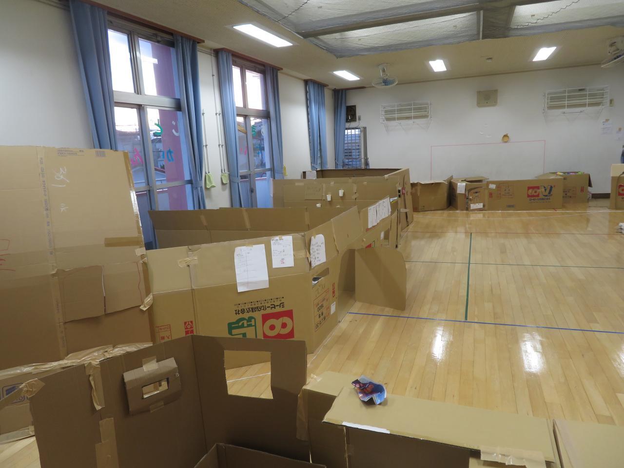 今年も2日間連続行事、『ダンボールハウス商店街』あそびを行いました。児童館が『秋葉シティー』になります
