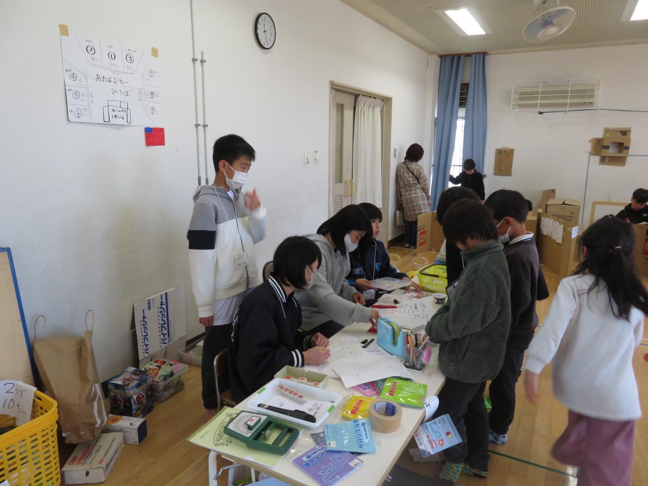 今日から、5・6年生に秋葉シティーの職員になってもらいました。町の平和・困りごと解決・治安維持担当の『ポリス』・イベントを計画し運営する『企画事業部』・『事務員』を7名の5・6年生にお願いしました。