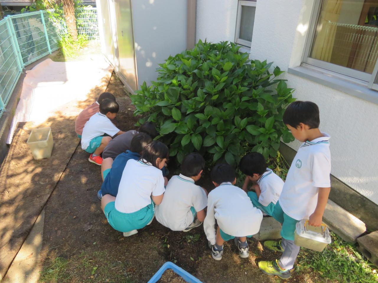 児童館の裏庭に、草が生えないようにしいてある古くなったカーペットの下は、虫の宝庫です(^^♪