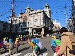 年長児は、3年ぶりにモダン寺(本願寺神戸別院)に参拝。長い道のりの中、初めは緊張感が見られたが、時間が経つにつれゆるみ、見えた物を興奮気味に友達や引率職員と共有していた。モダン寺での参拝、メリケン波止場でのお弁当、遊覧船、カモメの群れ、どんぐり銀行、神戸の街並み・地下街、見るもの聞くものが全てが新鮮で、子ども達は始終良い表情でした。