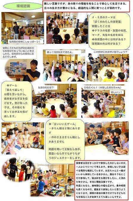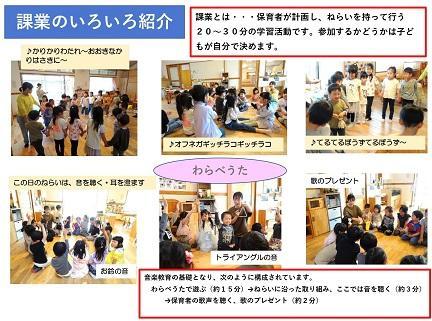 課業とは・・・保育者が計画し、ねらいを持って行う 20~30分の学習活動です。参加するかどうかは子ど もが自分で決めます。