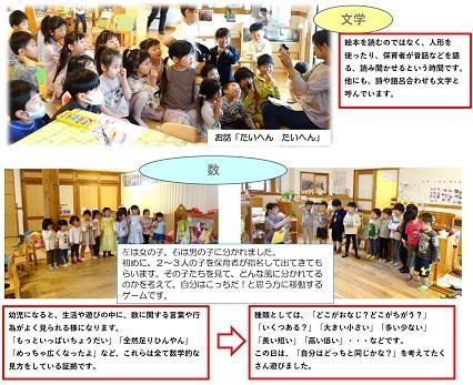<文学>絵本を読むのではなく、人形を 使ったり、保育者が昔話などを語 る、読み聞かせるという時間です。 他にも、詩や語呂合わせも文学と 呼んでいます。