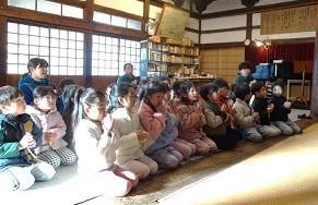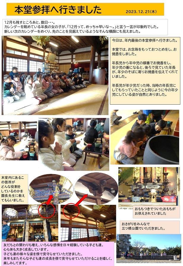 今日は、年内最後の本堂参拝へ行きました。本堂では、お念珠をもっておつとめをし、お焼香をしました。年長児から年中児の順番でお焼香をし、年少児の番になると、後ろで見ていた年長が、年少のそばに寄りお焼香を伝えてくれていました。年長児が年少児だった時、当時の年長児にしてもらっていたことと同じように今の年少児にしている姿が自然とありました。