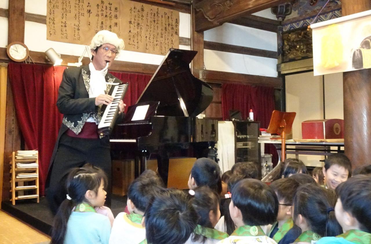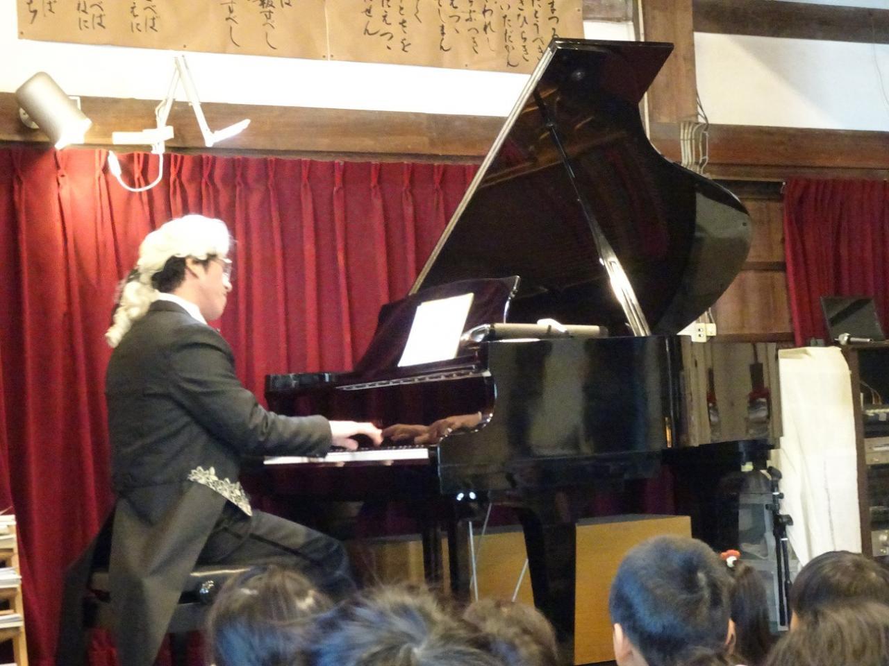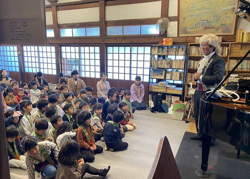 特別ゲストは、ピアニストの加藤英雄さんでした。モーツァルトの扮装をして、鍵盤ハーモニカで「アイネ・クライネ・ナハトムジク」を奏でながら登場。・キラキラ星変奏曲 ・トルコ行進曲 ・子犬のワルツ ・さんぽ(トトロ) ・猫踏んじゃったの即興などの曲を、楽しいおしゃべりやピアノという楽器の構造のお話しを交えて演奏して下さいました。