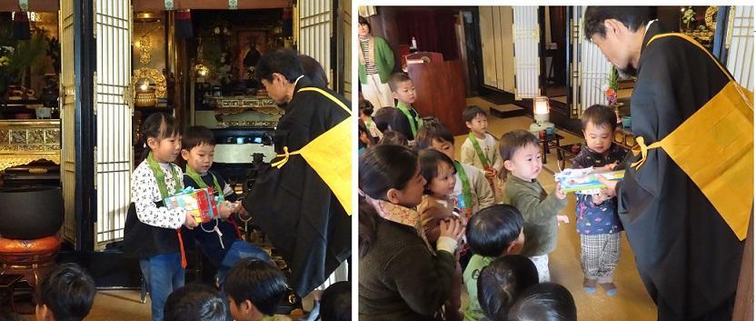 続いて、先生達による歌「だんご3兄弟」があり、最後に各クラスにおもちゃのプレゼントがありました。