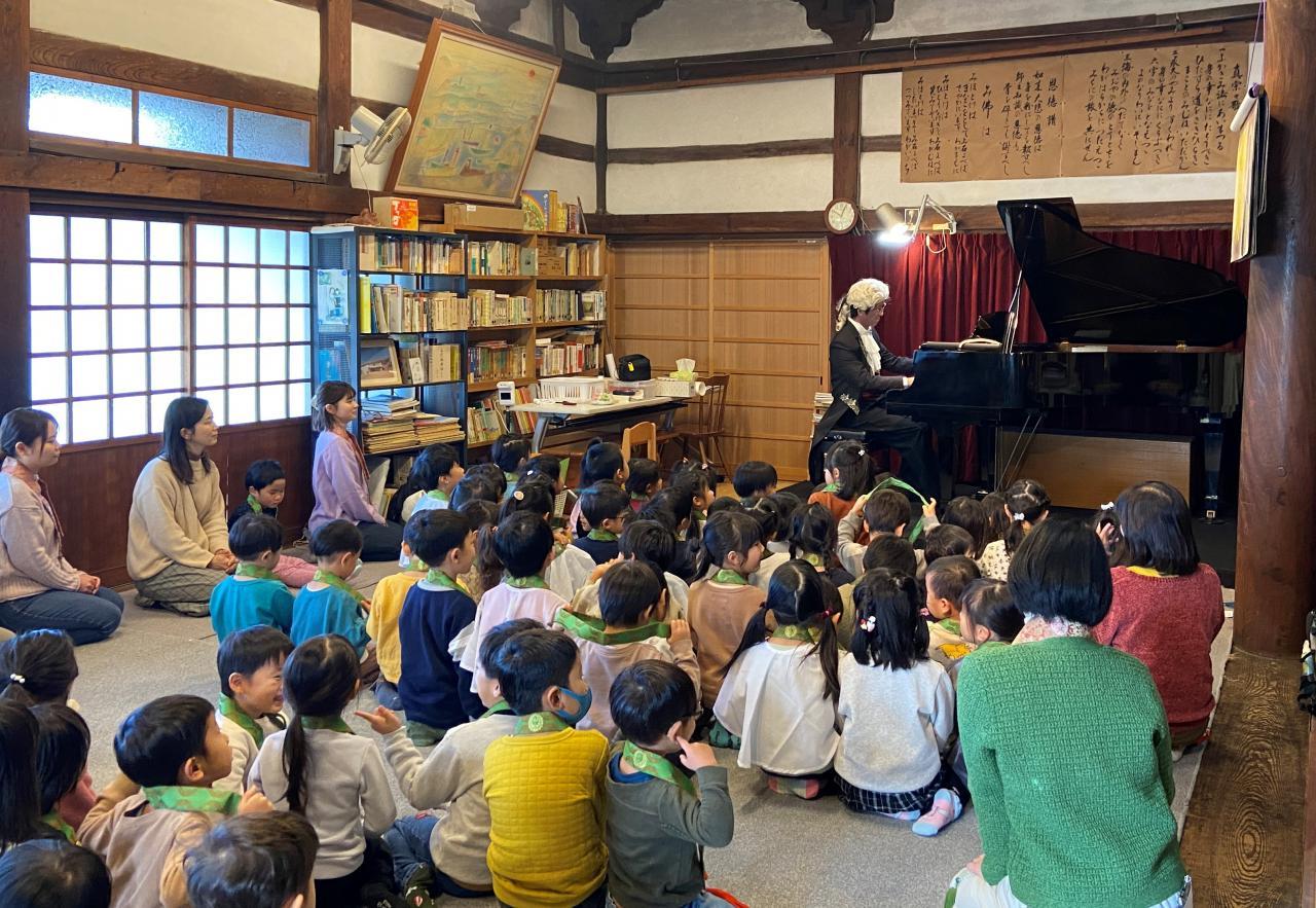 子ども達は、知っている曲が始まると口ずさんだり体を揺らしたり叩いたり、ピアノを弾くように指で拍をとったり、知っている楽器を吹く仕草をしたりピアノの多彩な音色に驚いたり笑ったり、様々な反応を示しながら、興味深く聴き入っていました。