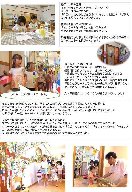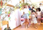 ちょうちん行列で進んでいくと、りすぐみの部屋がいつもと違う雰囲気。りすぐみに着くと園長先生から1人一つずつラムネを頂きました。部屋にもどってみんなでぱくり。年長さんが書いたわくわくノートには「もらったラムネがおいしかった」と書いている子もいました。七夕の特別な一粒。あまーいいい思い出になったようです。