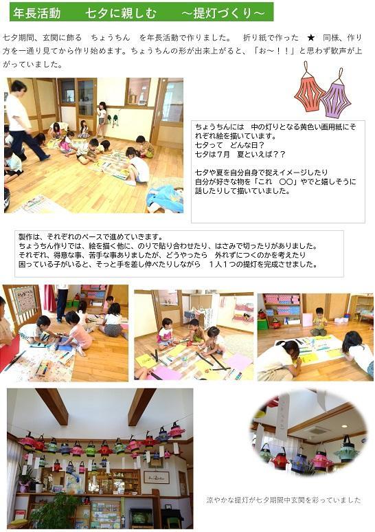 七夕お楽しみ会の当日(7/5)は年長さんが提灯を持って、園内を歩く提灯行列を行いました。せっかくだから年長活動でしたわらべうたを歌う?と聞いてみると「たなばたの~」ってやつがいいあれ好きとお気に入りのわらべうたを歌いながら園内を歩きます