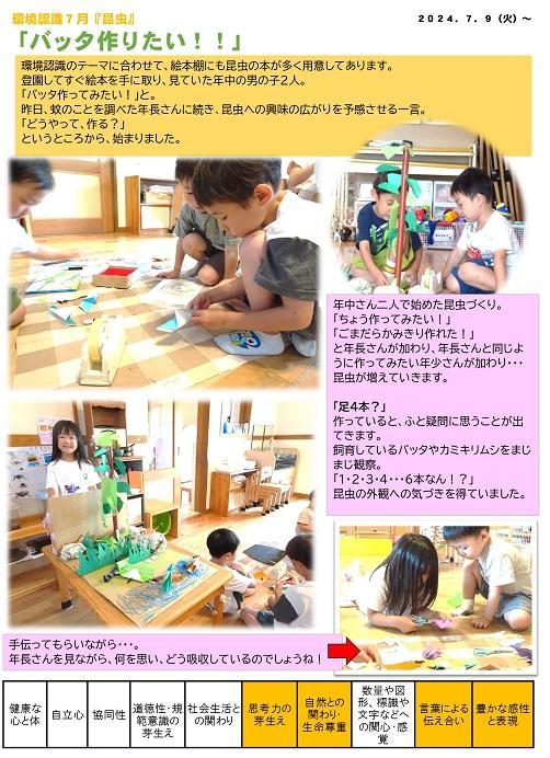 年中さん二人で始めた昆虫づくり。「ちょう作ってみたい!」「ごまだらかみきり作れた!」と年長さんが加わり、年長さんと同じように作ってみたい年少さんが加わり・・・昆虫が増えていきます。