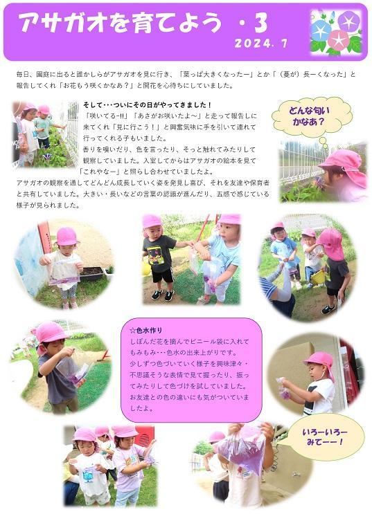 「咲いてるー!!」「あさがお咲いたよ~」と走って報告しに来てくれ「見に行こう!」と興奮気味に手を引いて連れて行ってくれる子もいました。香りを嗅いだり、色を言ったり、そっと触れてみたりして観察していました。入室してからはアサガオの絵本を見て