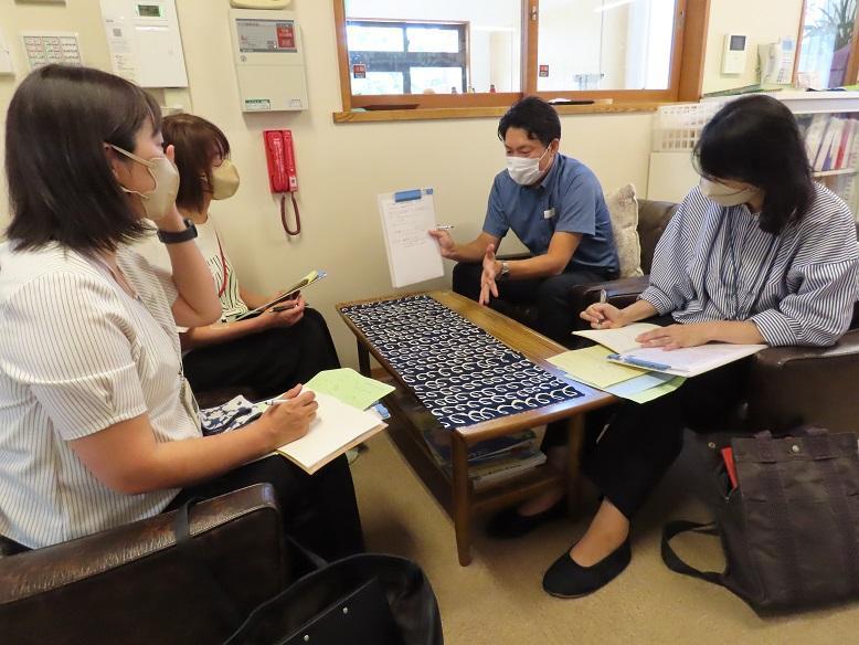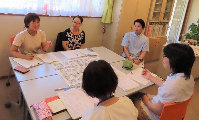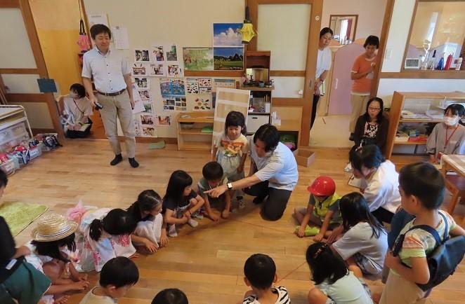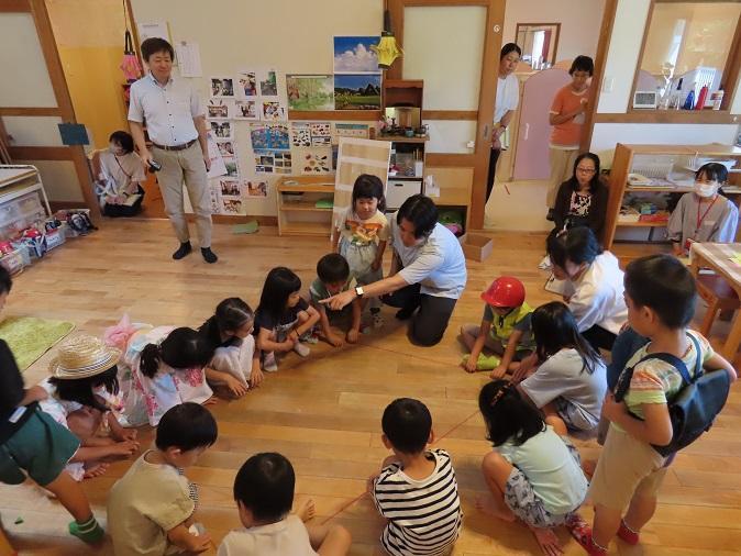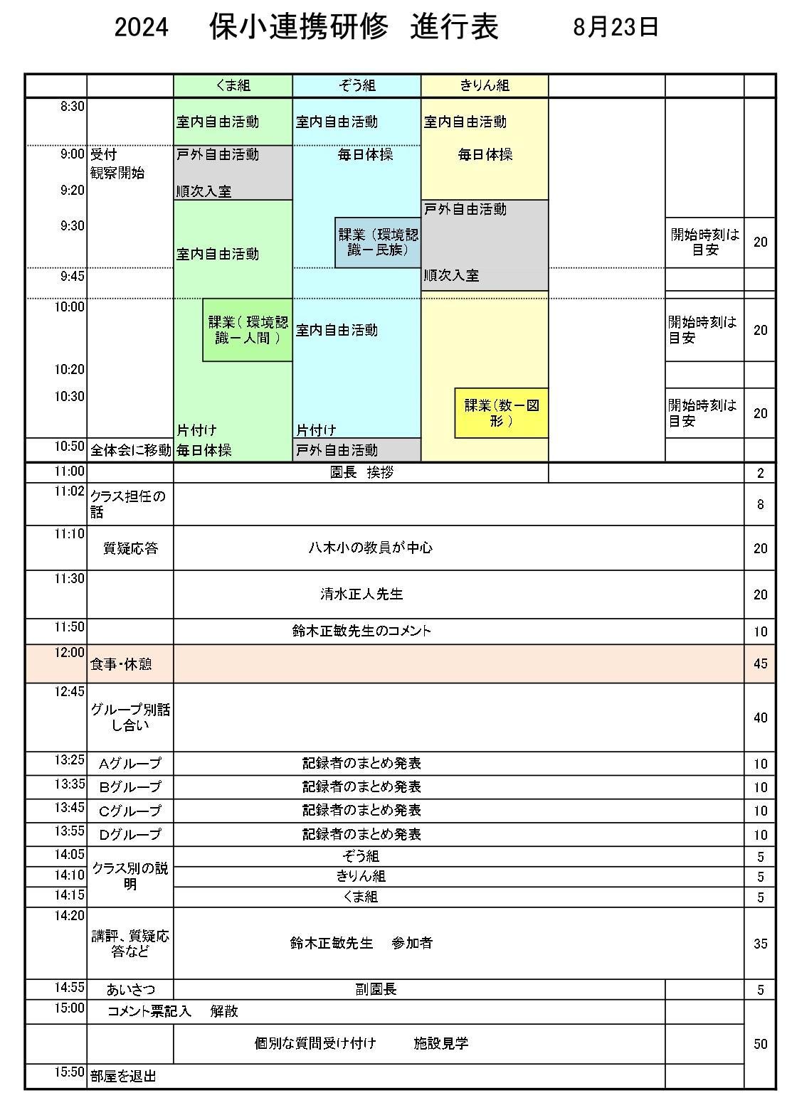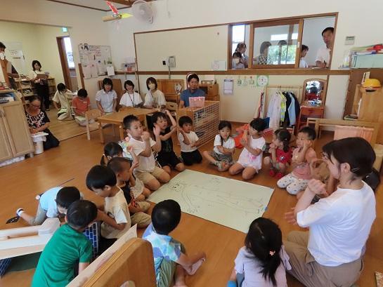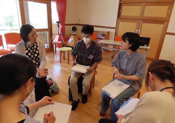 今年は初めての試みとして、研修をさらに充実したものにするため、午前の時間に加えて午後も3時まで研修時間とする企画を立てました。午前中は幼児異年齢混合3クラスの観察と清水正人先生(元八木小学校教諭)のお話。午後は、4グループに分かれての話合いおよびその概要の発表、最後に助言講師の鈴木正敏先生(兵庫教育大大学院教授)の講評と質疑応答でした。