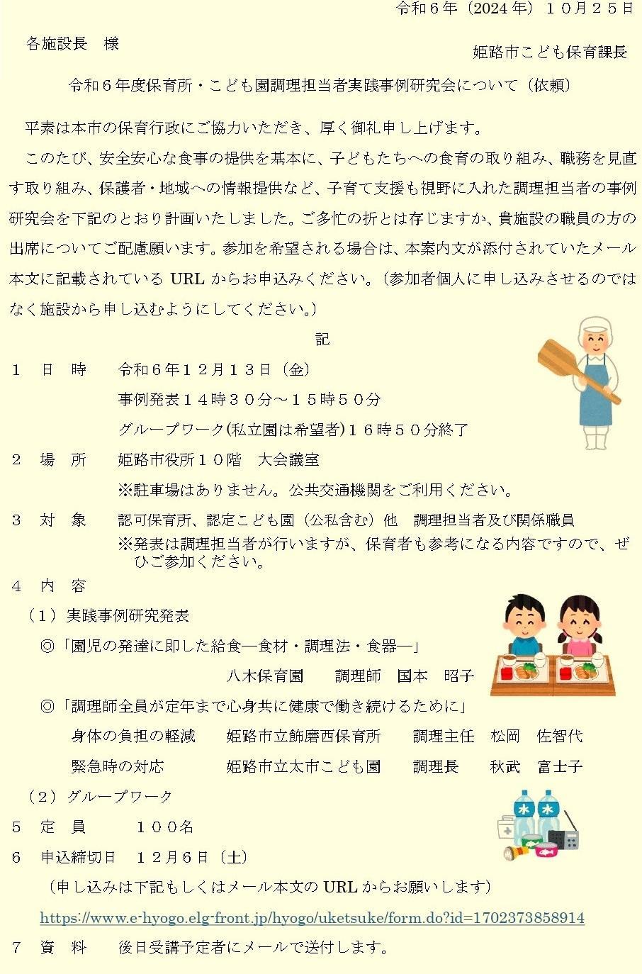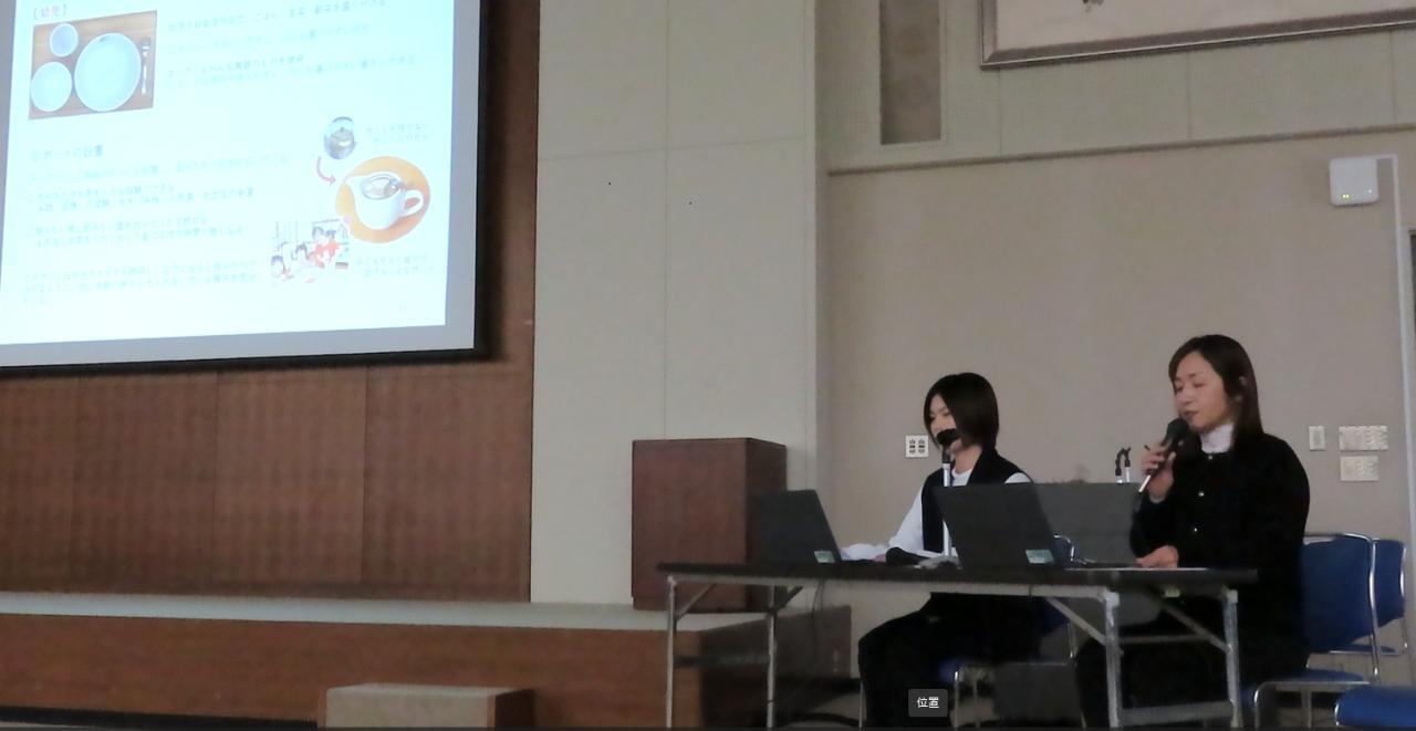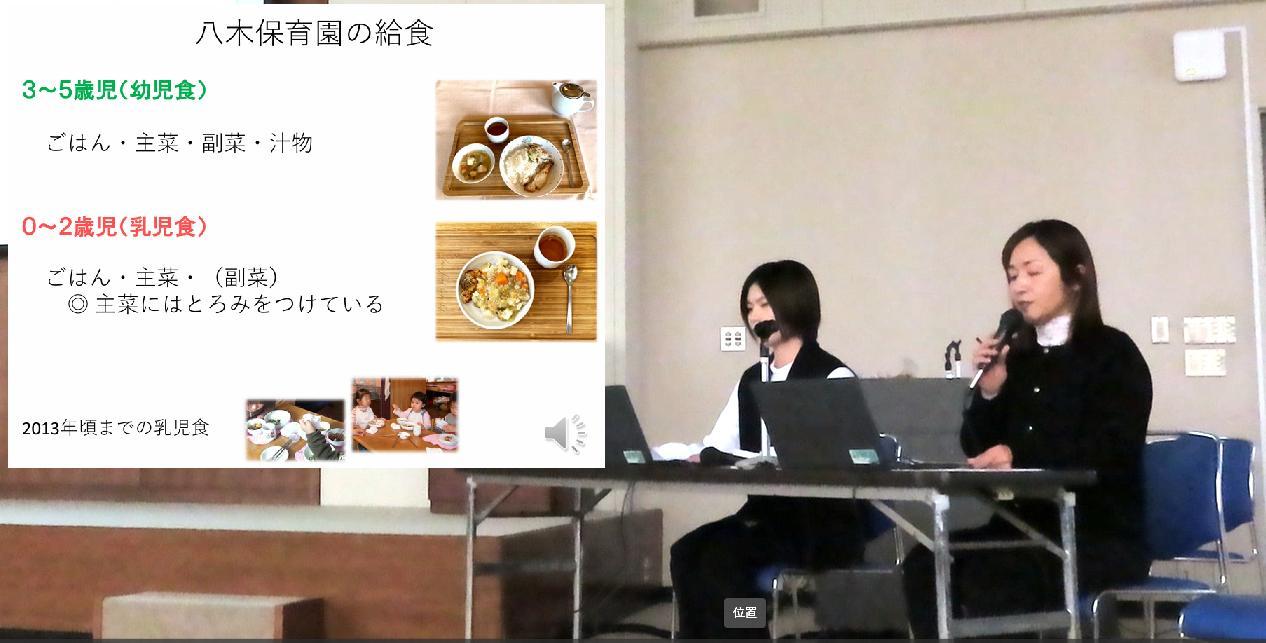 姫路市主催の調理担当者実践事例研究会で実践発表をしました。約25分間の持ち時間で、「園児の発達に即した給食 -食材・調理法・食器」と題して国本調理師と松田栄養士が参加約70名の公立私立園関係者の前で発表しました。