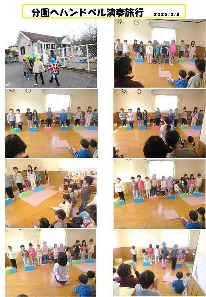 年長児がハンドベルの演奏会に来てくれた。演奏が始まるとじっと聴き入っている子ども達。知っている曲は一緒に歌っている子もいて、一つの曲が終わるたびに拍手をして目を輝かせていた。いつもと違う環境に対応できずに泣いていた男児も、演奏が始まる頃には落ち着き、演奏が始まると年長児がハンドベルを鳴らしている姿を真似して全身で音を感じながら鑑賞していた。