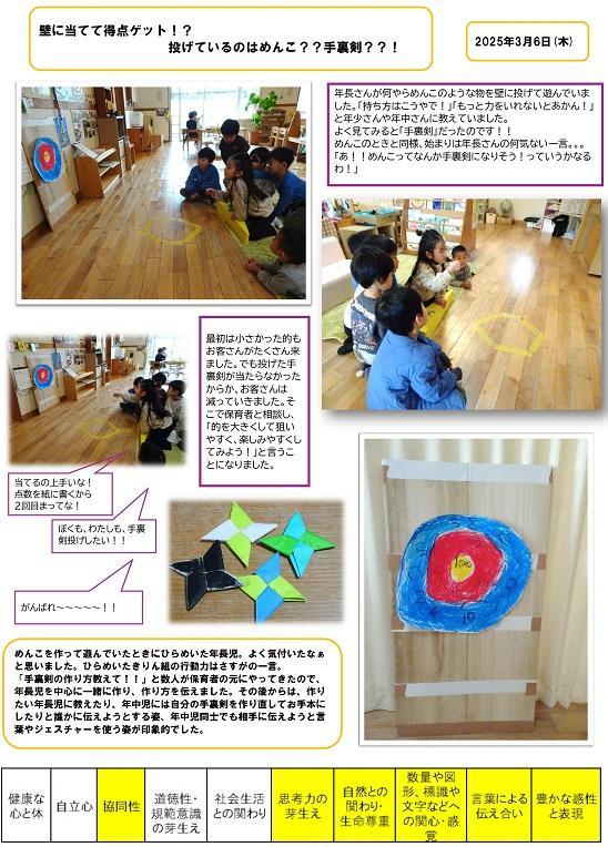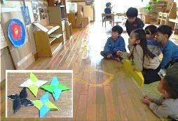 「手裏剣の作り方教えて!!」と数人が保育者の元にやってきたので、年長児を中心に一緒に作り、作り方を伝えました。その後からは、作りたい年長児に教えたり、年中児には自分の手裏剣を作り直してお手本にしたりと誰かに伝えようとする姿、年中児同士でも相手に伝えようと言葉やジェスチャーを使う姿が印象的でした。