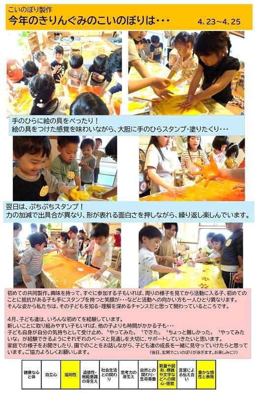 4月、子ども達は、いろんな初めてを経験しています。新しいことに取り組みやすい子もいれば、他の子よりも時間がかかる子も・・・ 子ども自身が自分の気持ちとして受け止め、〝やってみた〟〝できた〟〝ちょっと難しかった〟〝やってみたいな〟が経験できるようにそれぞれのペースと見通しを大切に、サポートしていきたいと思います。家庭での様子をお聞きしたり、園でのことをお話しながら、子ども達の成長を一緒に見守っていけたらと思っています。ご協力よろしくお願いします。